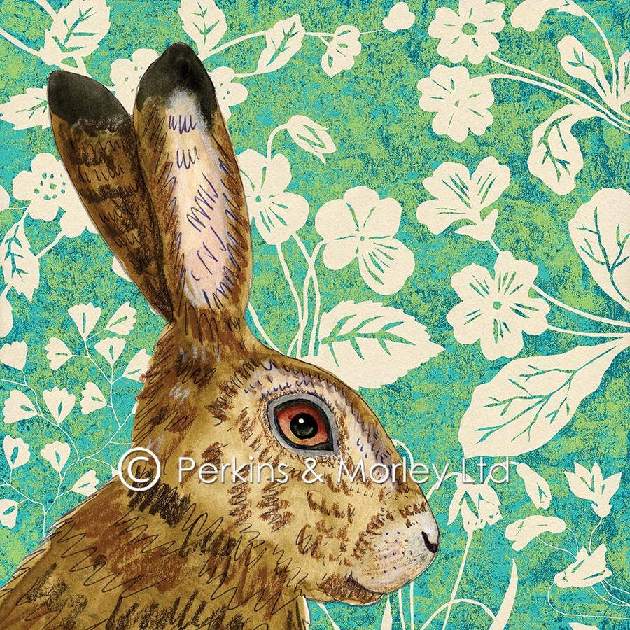 Illustrations by Jill Perkins. Beautiful watercolour paintings of animals and birds in front of different woodcut style prints of florals, leaves and ferns. Cards are 140mm x 140mm (5.5 x 5.5inch) when folded and are printed on 300gsm recycled card. Each card comes in a 100% biodegradable bag with a brown recycled paper envelope. Blank inside.