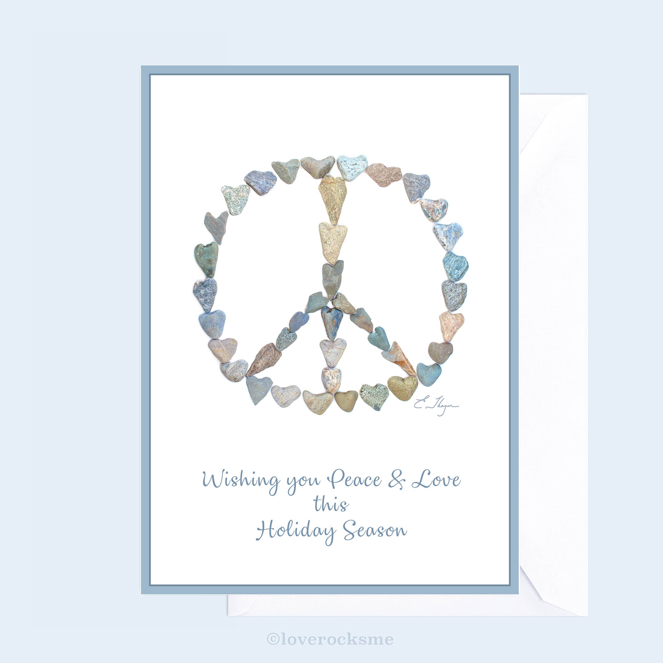 An image of my large flat-lay photograph created with heart rocks, this 5x7" note card on soft white matte card stock is blank on the inside and includes a white A-7 envelope. Colorful accents have been applied digitally. The style number and $4.99 pricing appears on the back. Made in Maine with recycled paper.
