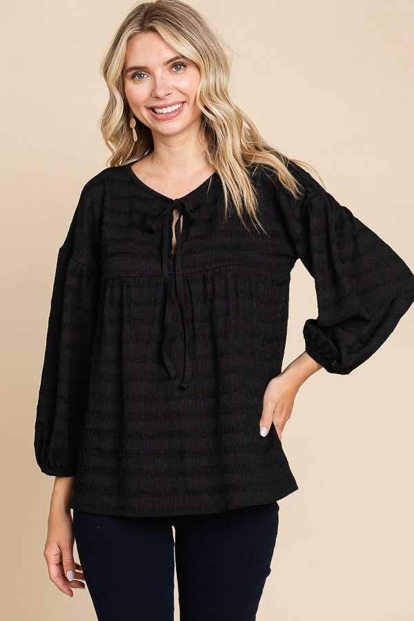 *Regular Size Style#CJT1814Q* -Draw String -Peasant -Solid Blouse -3/4 Sleeve -Relaxed Fit -Bubble Pleated Jersey -99% Polyester 1% Spandex -Imported. Designed in USA