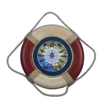 A decorative plethora of functionality and grace, the Lifering clock is classy and functional all while creating the perfect nautical mood in your home, office, or pool house. A Nautical star is displayed in the middle of the clock with roman numeric characters at the end of each star point for an elegant touch. Sailors knots mark individual hours, and the real map background supplies a strong feel of being on a real ship. The handpainted decorative lifering is a beautiful navy blue and cream off-white providing a slight patina as a real lifering would have after years at sea. Dimensions: 12” Long x 2.5” Wide x 12” High NOTE: For decoration only, this is not a life saving device. Wall mounting hardware not included. Real rope straps as a lifering would have Real rope sailors knots for a great reference point Centered Nautical star and Roman Numeric clock display