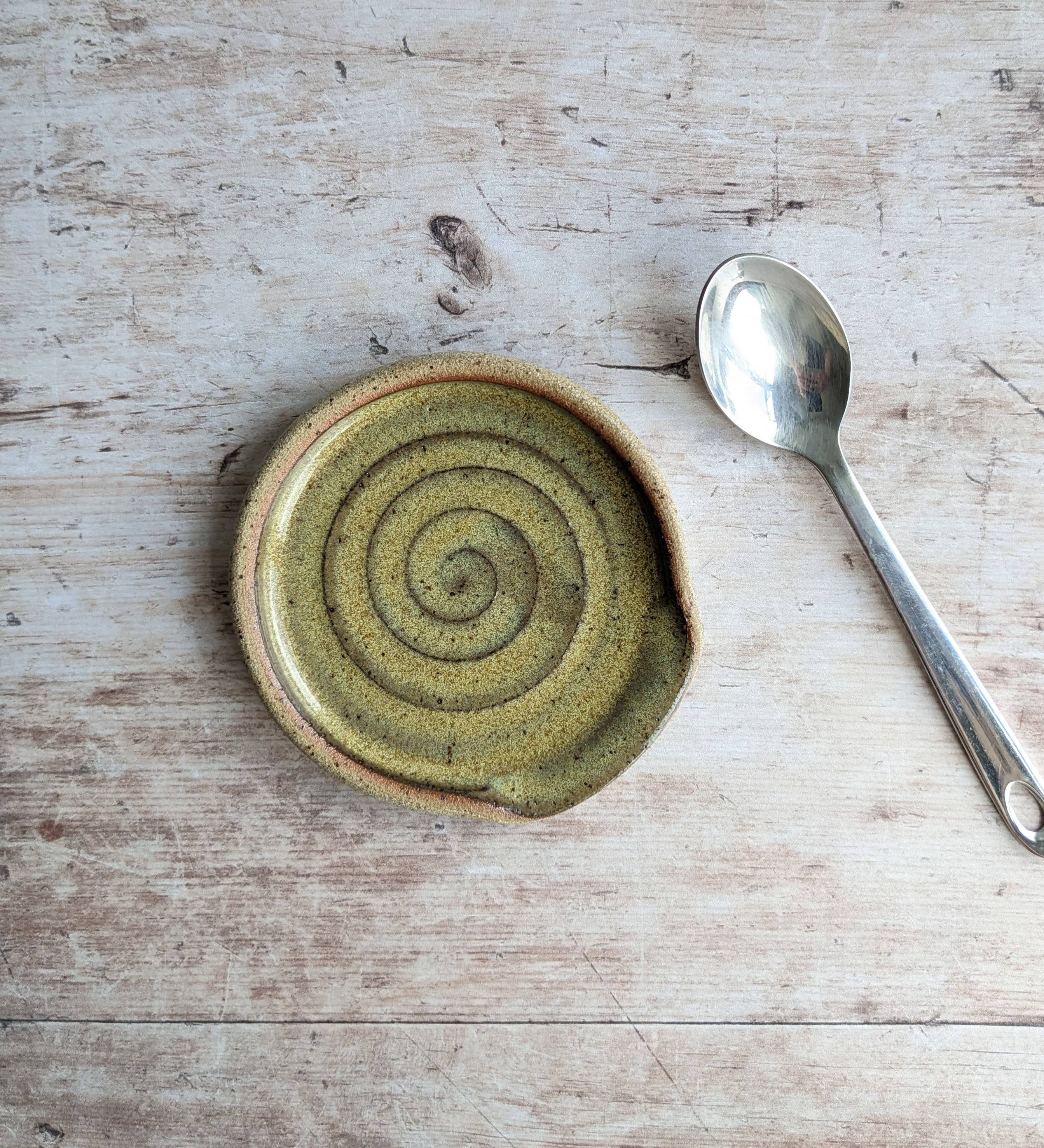 This listing is for a single, handmade, wheel-thrown spoon rest. Made from distinctive, speckled stoneware clay and finished in my 'MOSS' glaze - a glossy green/brown which breaks into darker brown on the edges, these are perfect for a neutral or rustic style kitchen. They are hard-wearing and suitable for dishwashers or hand-washing. Size (approx) -12cm diameter (to fit a cooking spoon/spatula) Mini (teaspoon-sized) spoon rests are also available in the same style. Each piece is individually handmade and hand-glazed, so there will be slight variations in size, shape and glaze effects - each one is slightly unique in its own way, it's what gives handmade pottery its character!