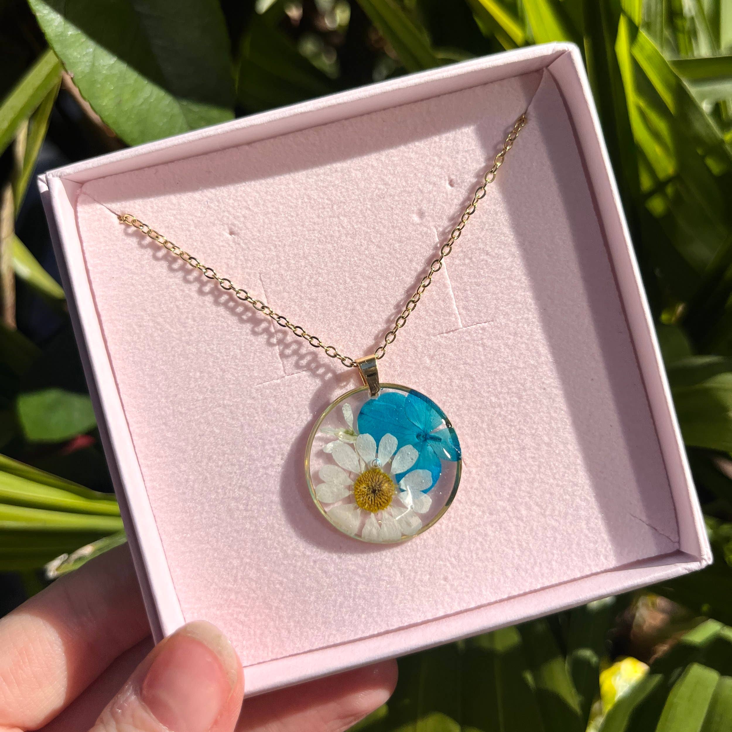 Handmade resin pendant with real pressed daisy set in a round bezel. This pendant is finished with a hypoallergenic stainless steel chain. Please note that as all of my jewellery is handmade there may be slight variations between the products pictured. Chain length ~ 45cm