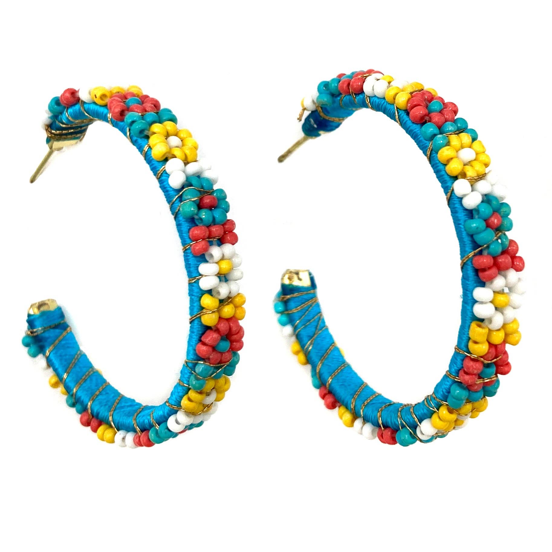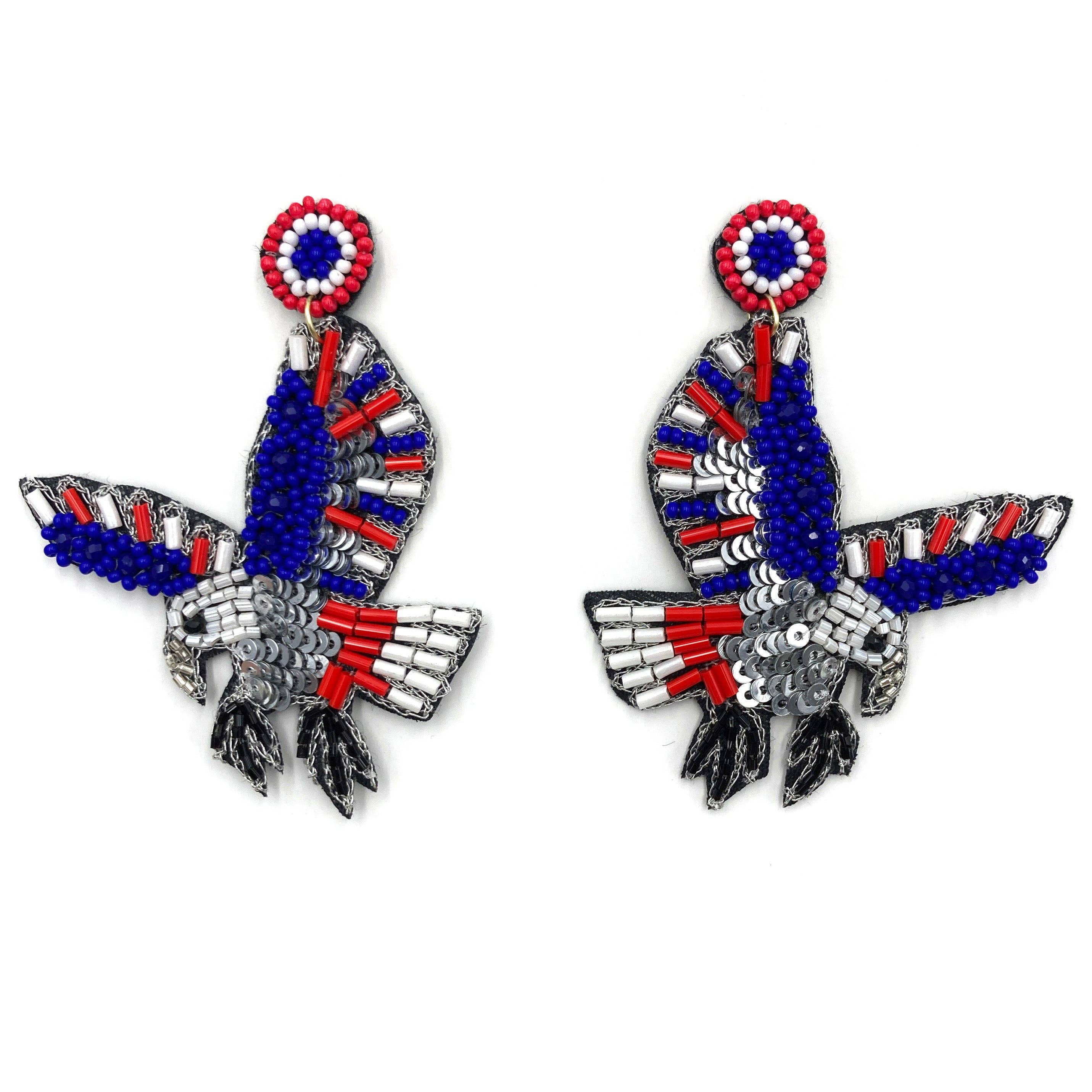 Introducing our Red White Blue Flag Seed Bead C Hoop Earrings. These hoop earrings are American Flag design with intricate seed beadwork in patriotic red, white, and blue colors. They are lightweight and comfortable to wear. Add a touch of Americana to your style with these stunning earrings. Lead and nickel compliant. Adults only.