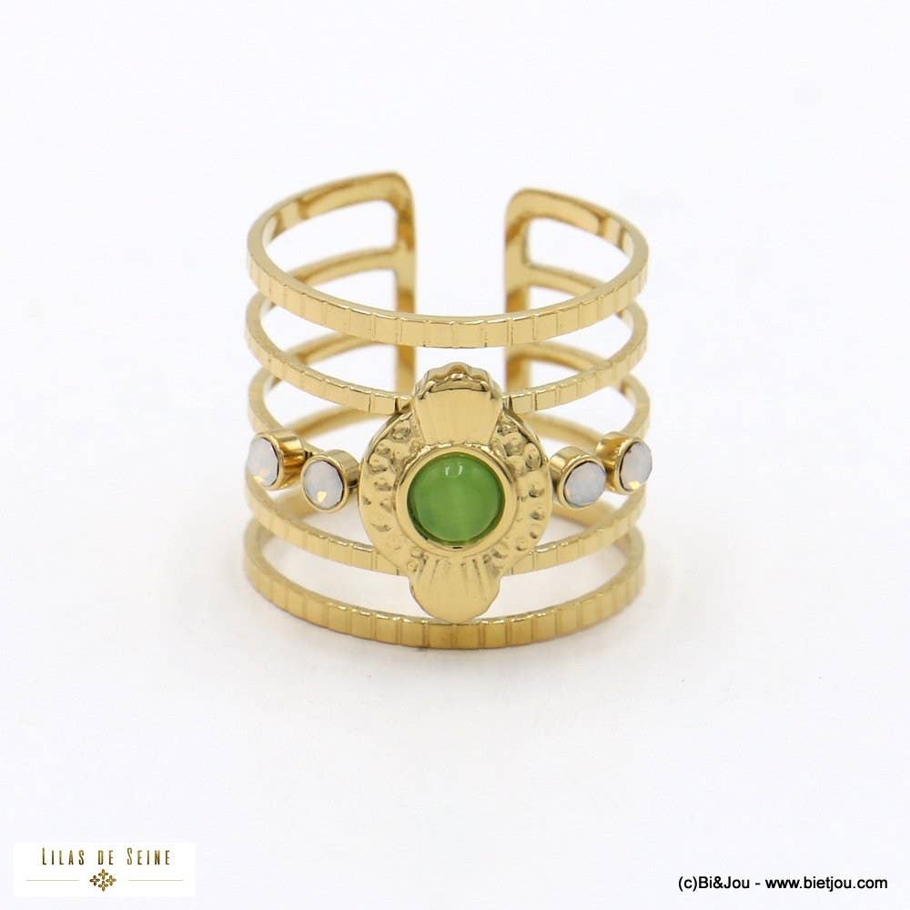 Large openwork stainless steel ring with 3 genuine stone cabochon for women 0422044. This steel ring is open and slightly adjustable. The width of the head is 22mm. This fashion jewelry is made of natural stone: the shape, color and size may vary. This fancy ring does not contain nickel, lead or cadnium and is anti-allergic, in accordance with European laws.