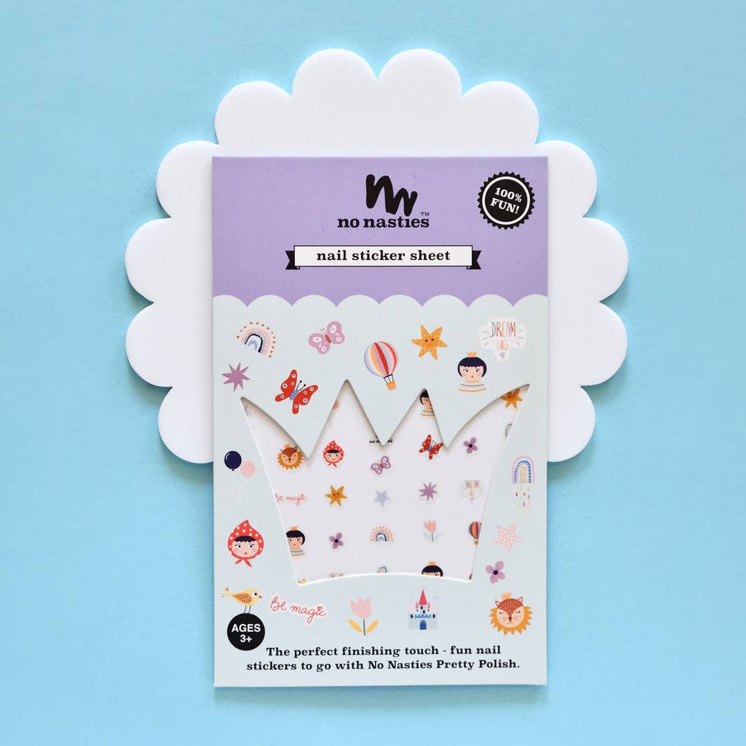 A pack of 25 nail stickers, each featuring an image such as a ladybird, bee, flower or butterfly from our Ladybird print. • Includes five sets of stickers of differing sizes to fit each of the average child's fingernails on one hand. • Intended for children from 3-10 years old • Not suitable for children under 3 years old (choking hazard) • In the rare event of an adverse reaction to the nail stickers, discontinue use immediately. • For external use only. • Adhesive ingredients: SAIB, dipropylene glycol dibenzoate, polyvinyl butyral • Ink ingredients: resin/monomer, toner/paste, photoinitiator, filler, auxiliary Packaging: • Outer: card sleeve with Euro hook slot • Inner: transparent plastic (PP) sleeve