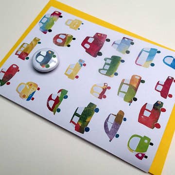 A6 greetings card with 25mm pin badge, with yellow C6 envelope, printed on FSC card & packed in compostable cellophane. A super bunch of balloons. This card has a wearable pin badge as part of the design making it extra special. It’s ideal for many occasions and is blank inside for your own message. The lovely badge will compliment almost any outfit. Illustrated by Lindsay in our seaside studio near Margate. It has been printed on 300gsm FSC certified white card. It is supplied with a bright yellow envelope. This card is A6 in size (105mm x 148 mm). The badge measures 25mm across and fastens with a pin. The badge is not suitable for children under six years old due to small parts and sharp point, there is a little note on the back of the card with this warning. There are lots of other designs in the badge card range.
