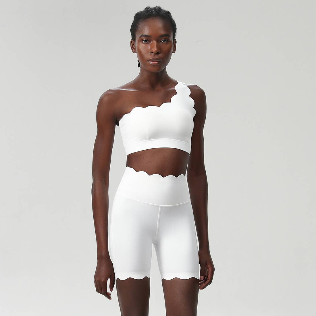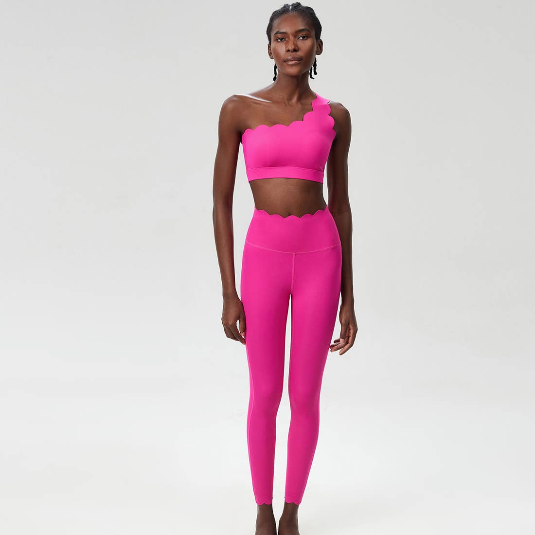 Pattern Type: Plain Sleeve Length: Sleeveless (Bra) Pants Length: Full-Length Tights Support: Mid-Weight Compression Fabric: Liquid Seamless Technology Material: Soft Knit Fabric Composition: 75% Nylon, 25% Spandex Key Details: 1.Seamless Design: Wave-patterned liquid leggings,enhancing flexibility and avoiding chafing. 2.High-waisted leggings for better support and coverage. 3.Crossover bra design for added support and style. Activity Compatibility: High-Intensity Training, Gym Workouts, Dance, Tennis/Badminton Care Instructions: Machine wash in laundry bag (use mild detergent). Wash dark colors separately. The clothes are made of high quality fabric, it will not be very transparent, no embarrassing lines.
