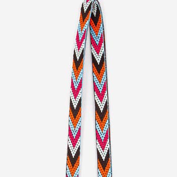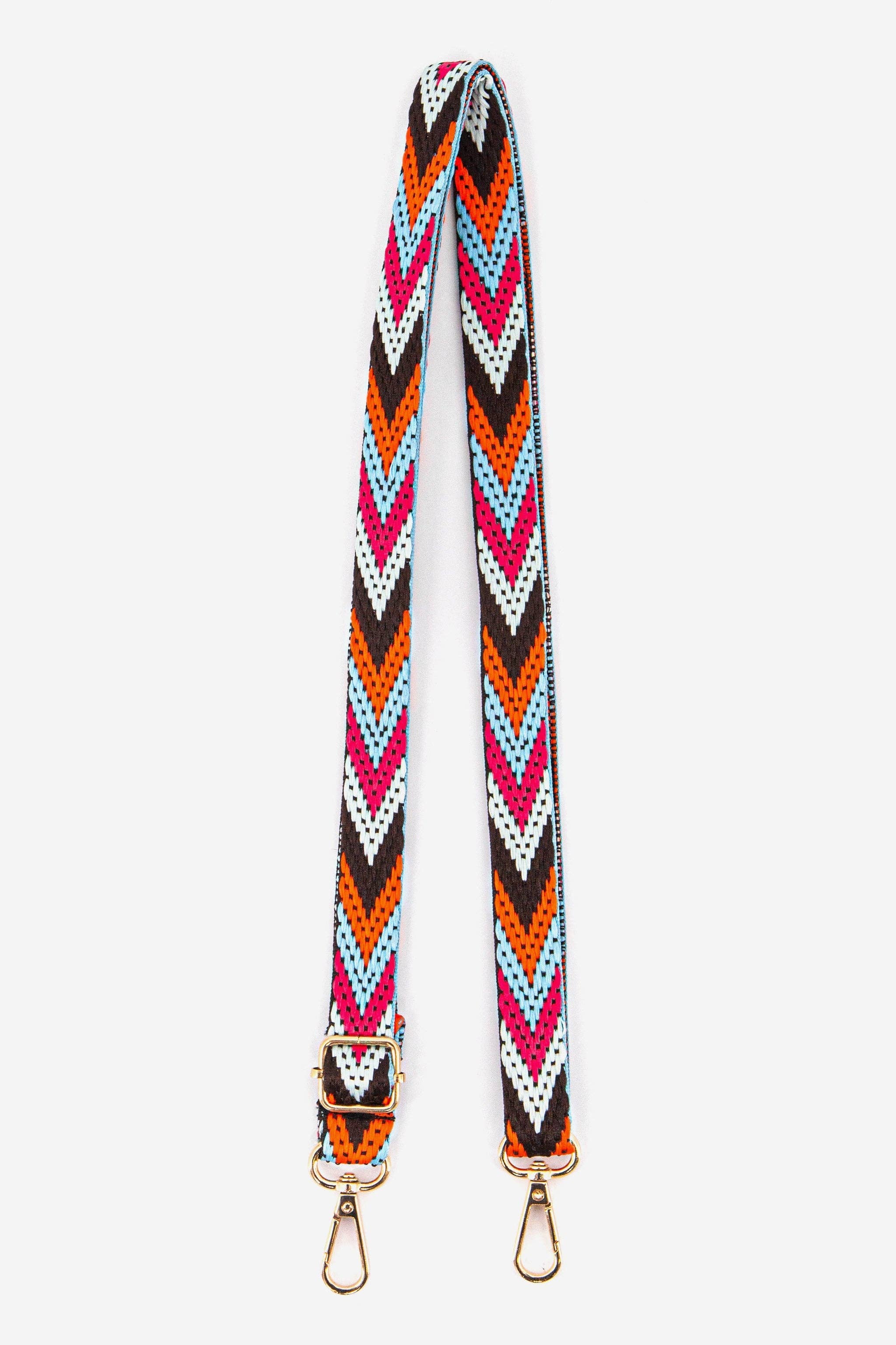 A soft woven strap in a fall color pallet, looks great with our pumpkin Callie bag . Straps slide to adjust so you get your own custom length. Changing straps is an easy click and ups your fashion style. Width: 2 inches Adjustable Length: 30 to 53+/- inches Available Hardware Finish: Gold