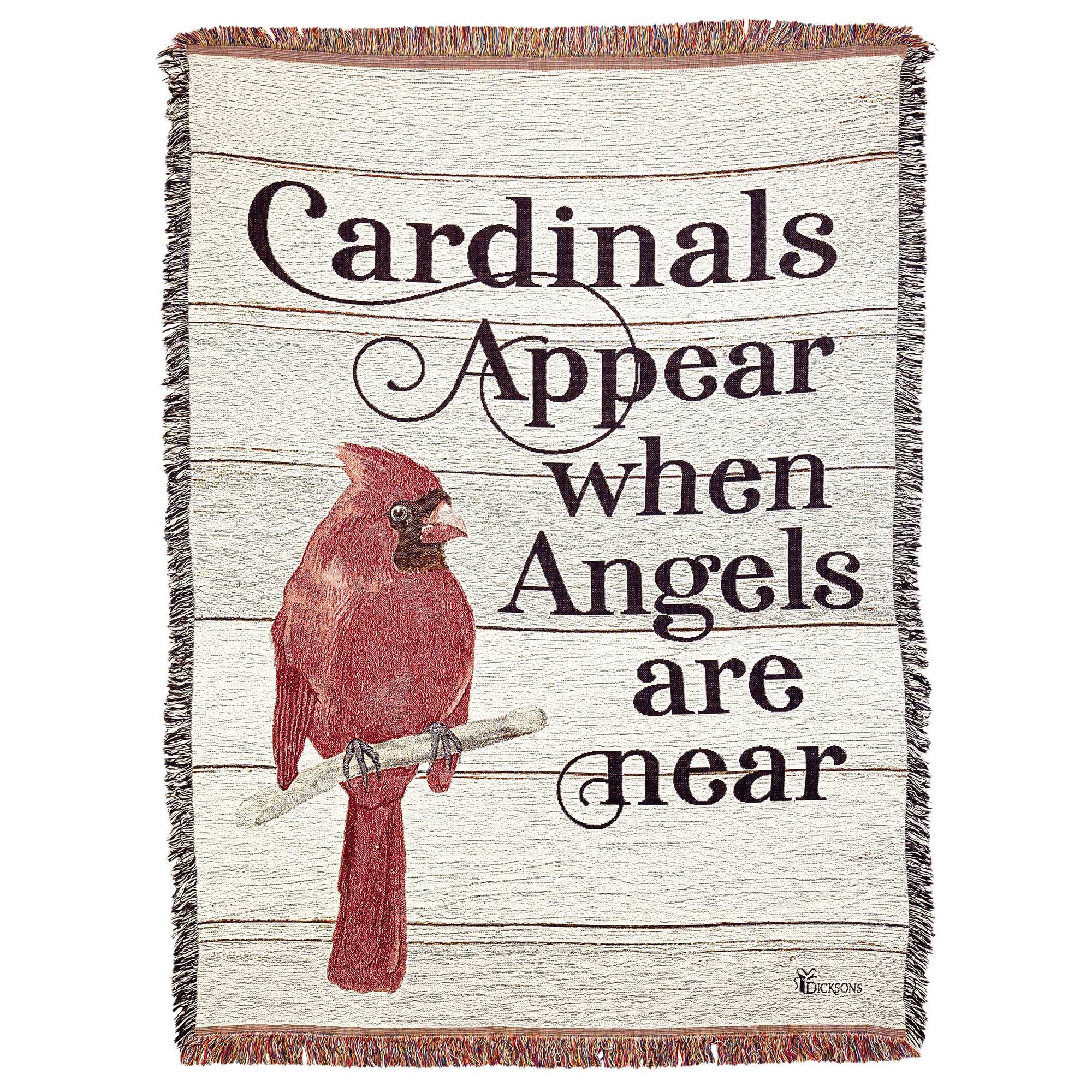 Gorgeous tapestry throw blanket has a branch-perching cardinal with the comforting poem, The Cardinal's Song. Woven of 100 percent heavyweight cotton, the throw has fringed edges and measures 52 inches wide x 68 inches high. Thoughtful bereavement gift. Cardinal design is copyright Nina Graff. Poem is copyright Dicksons, Inc.