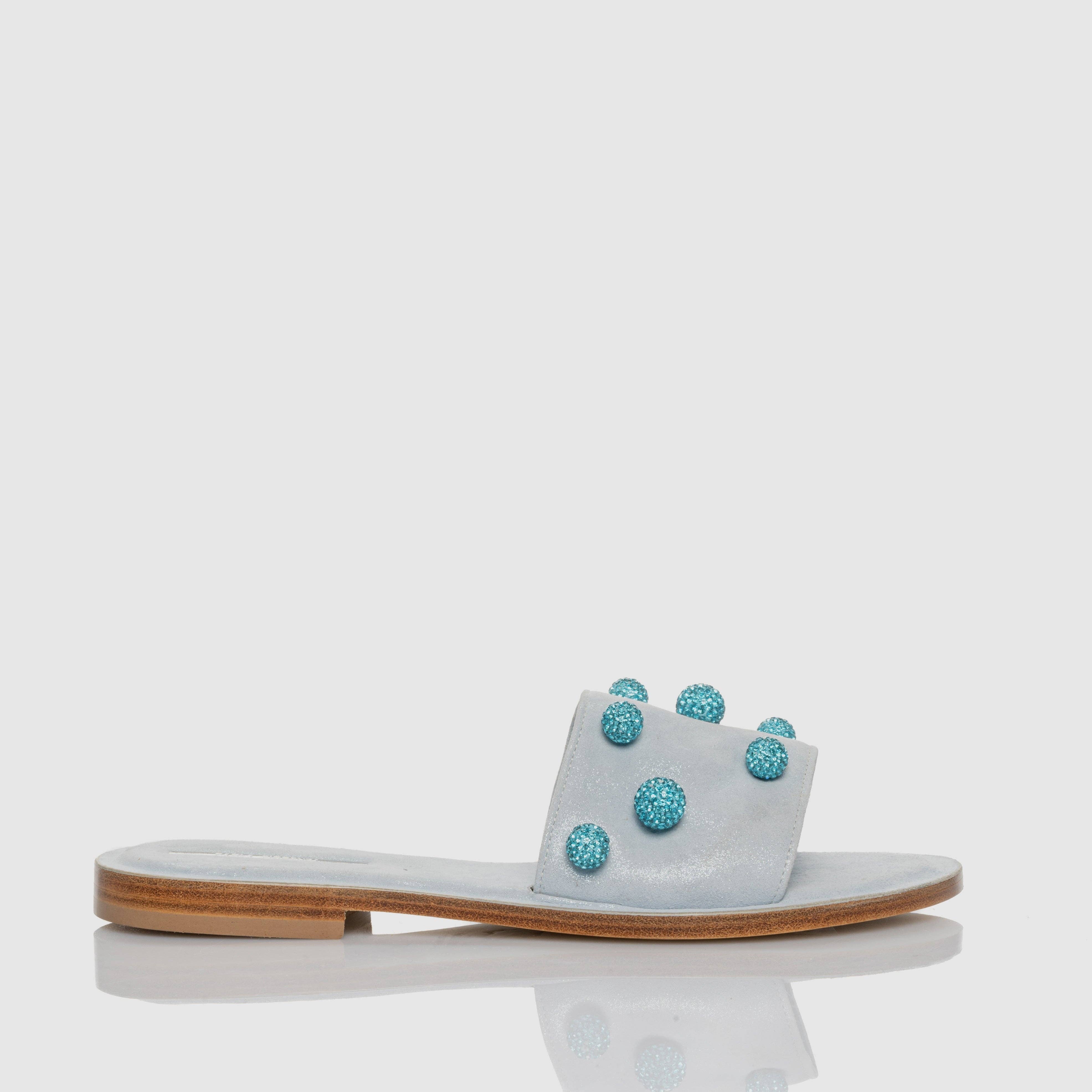 This flip flop sandal is entirely made of soft glitter suede, it has an upper embellished with microcrystals and spheres. * Drill glitter suede * Microcrystal sphere accessory * Heel height 10 mm * Leather heel with anti-slip rubber * Tuscan leather sole with logo * Made in Italy