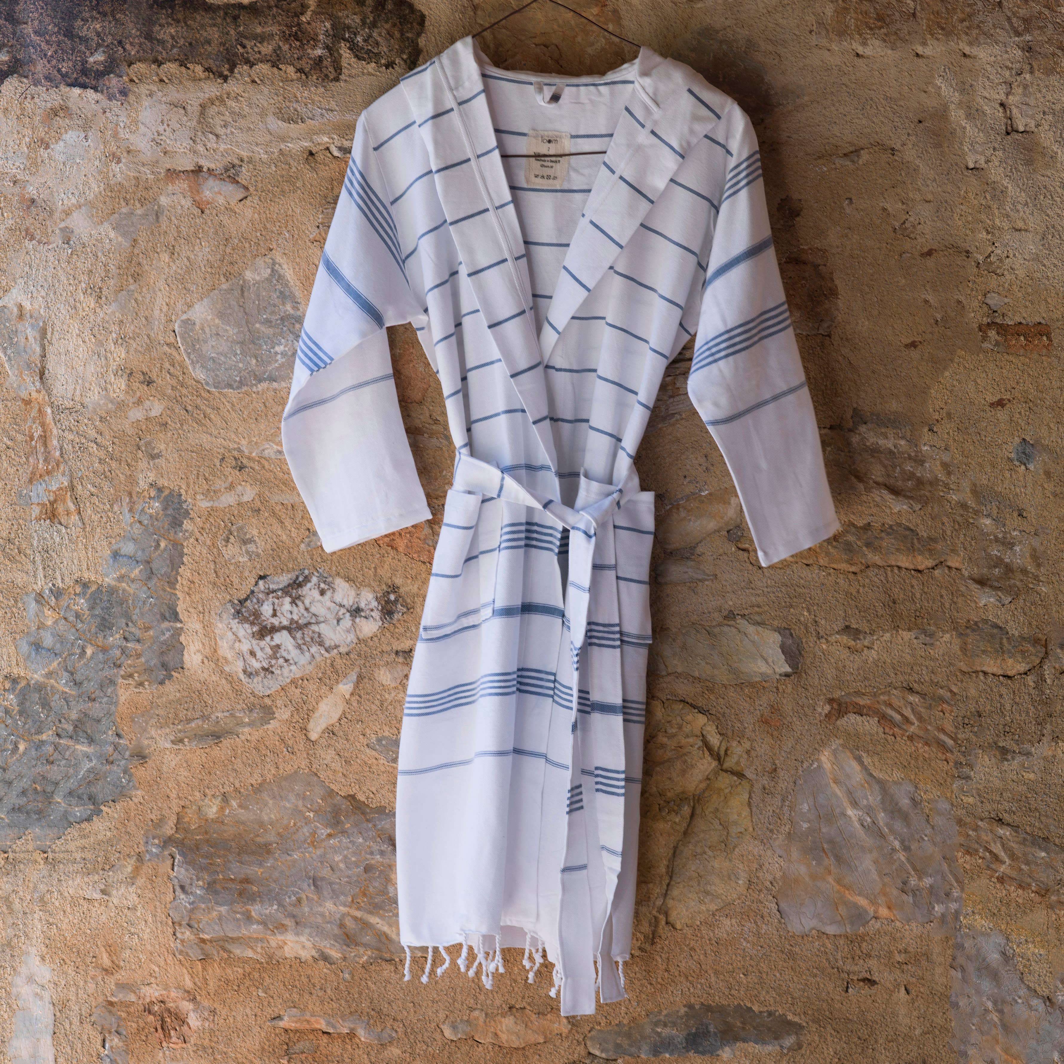Lightweight, thin, highly absorbent, fast-drying, durable, and eco-friendly. 100% cotton, hand-loomed. Size 1: Chest: 0,70 mt/27,5". Length: 1 mt/39,4". Size 2: Chest: 0,75 mt/29,5". Length: 1 mt/39,4". White-jeans blue. Washing Instructions: Machine wash on cold or warm Do not use bleach Tumble dry on low Do not dry clean