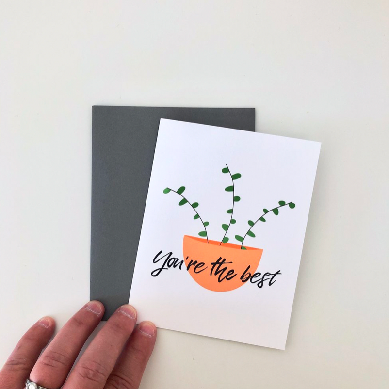 Outside: thank you for existing. Inside: blank. Size: 4.25" x" 5.5". Paper: bright white, recycled, heavyweight. Envelope: matching, recycled. Size: A2.