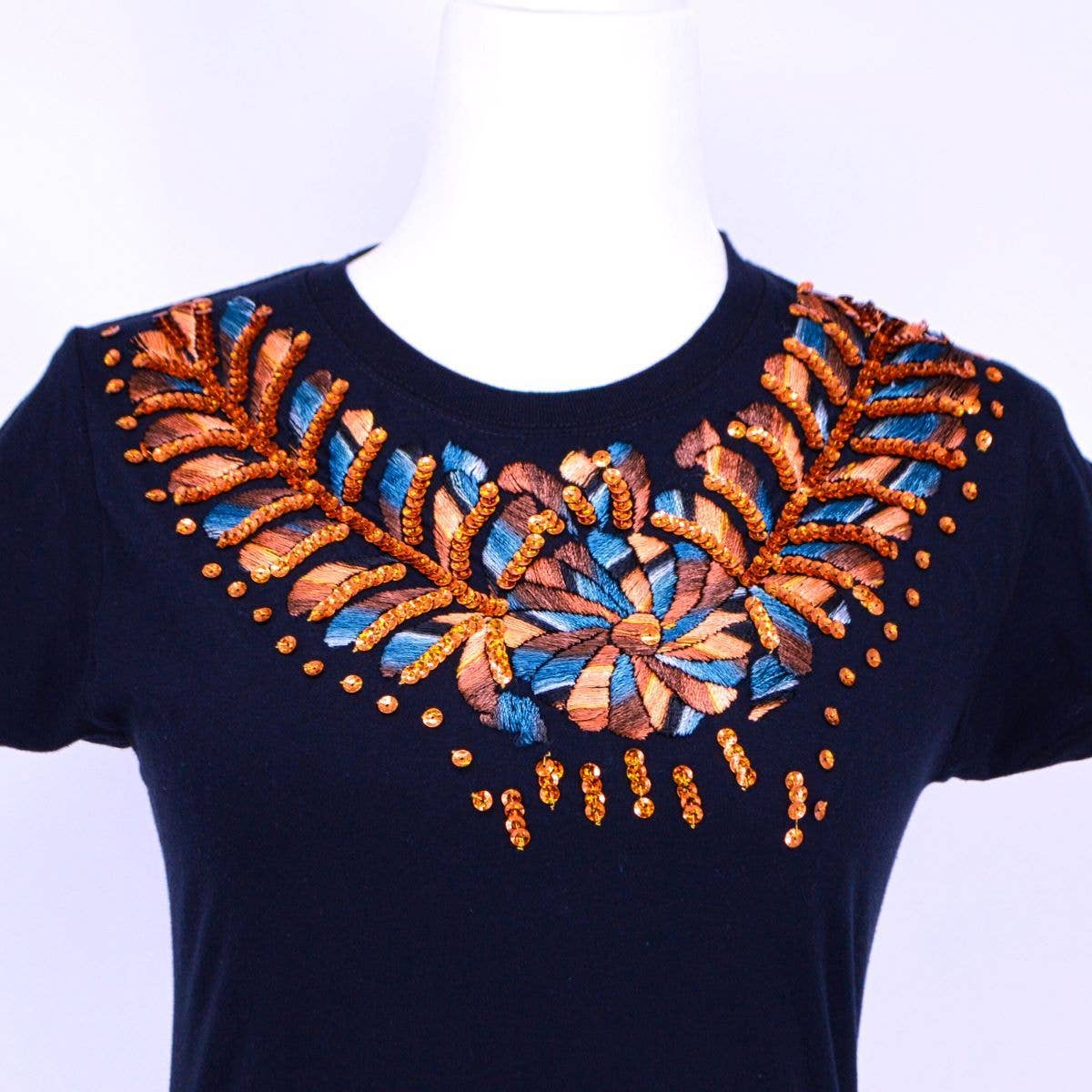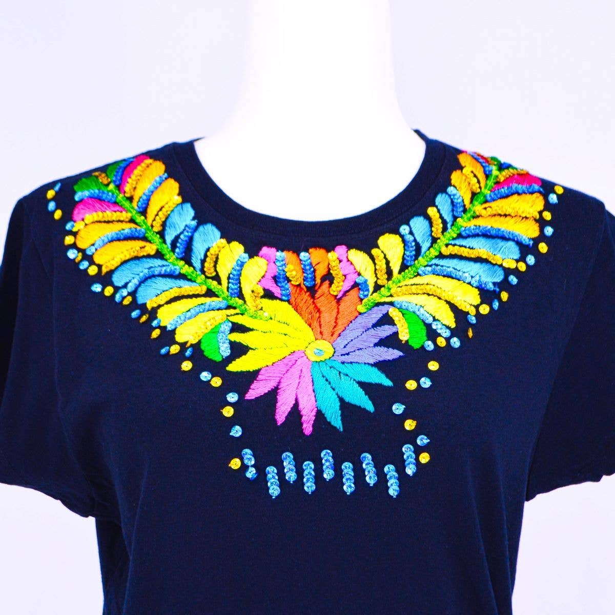 San Antonino embroidery cover the back of this denim jacket. This work of art will make your outfit. Each jacket is a one of a kind creation. Want an added touch of uniqueness? We can embroider your initials under the collar!!! If you would like this special touch, When you check out please tell us know up to 3 initials you would like hand embroidered - please note this under "Special Instructions" We will do this in in a purple, turquoise, white or blue please indicate which color you prefer.