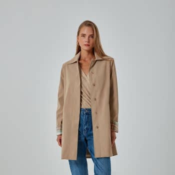 - Style No: MSJ7117B-8 FAUX LEATHER WELL MADE CANVAS TRENCH COAT WITH BELT TIE Model US 2, height:5'8' bust:34 C CUP waist:26 hips:34 SHE IS WEARING OUR SIZE SMALL 55%RAYON 45%PU