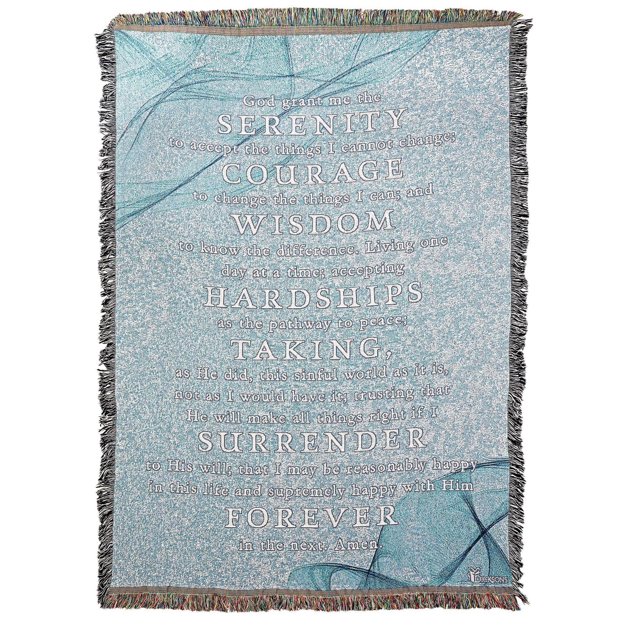 With its timeless message and neutral coloring, this soft, quality throw with the Serenity Prayer makes an excellent gift for just about anyone. Great for decorating a wall or furniture, or simply for a little extra warmth. Made of 2-layer medium weight 100% cotton. Size is 46” x 68”.