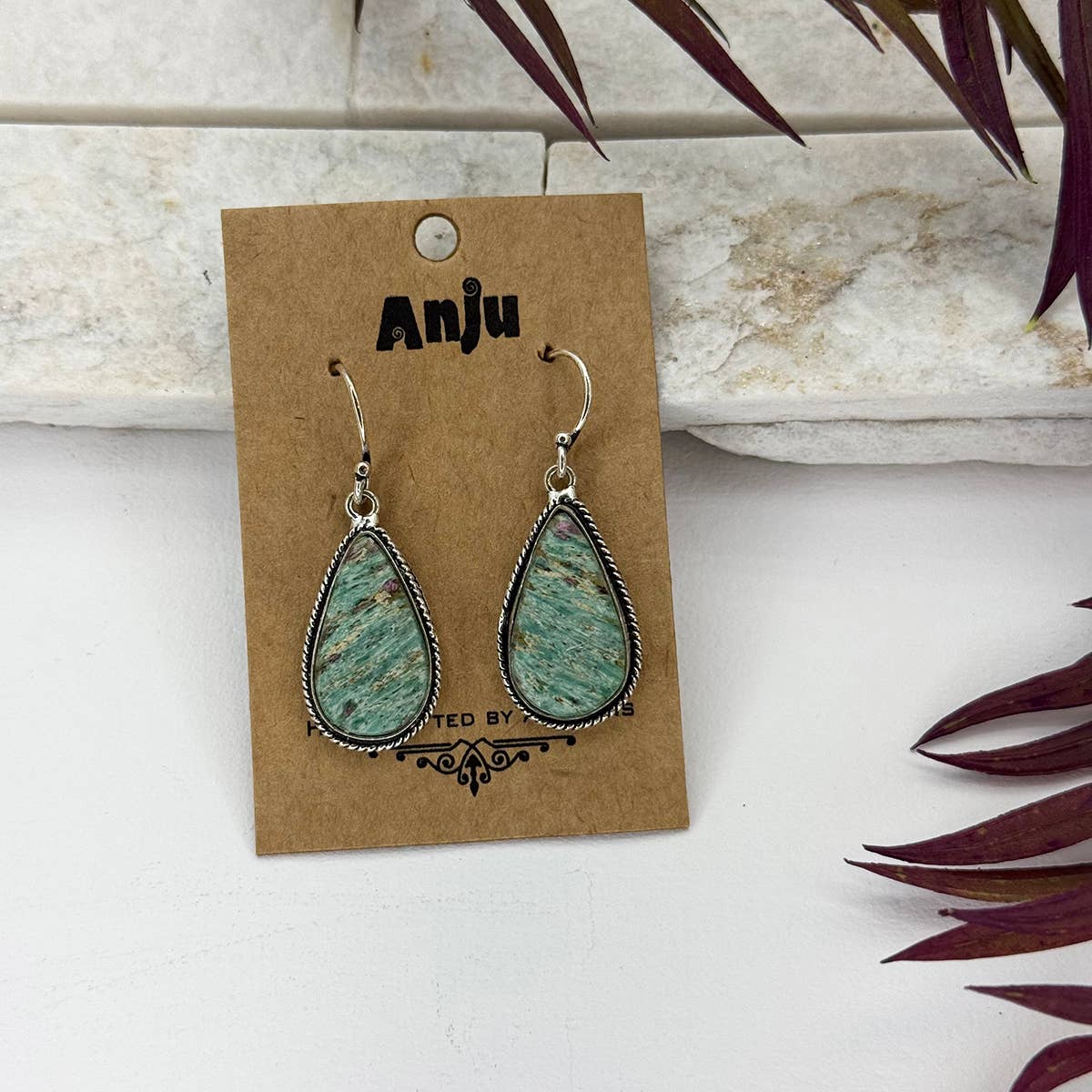 SKU: E47AZ Made in India Colour: Blue and Silver Material: Brass and Stone Stone type: Amazonite Style: Bohemian Weight: 45.36 g (1.6 oz) Product materials: Plastic-free Packaging: Recyclable Production: Ethically sourced and Fair trade