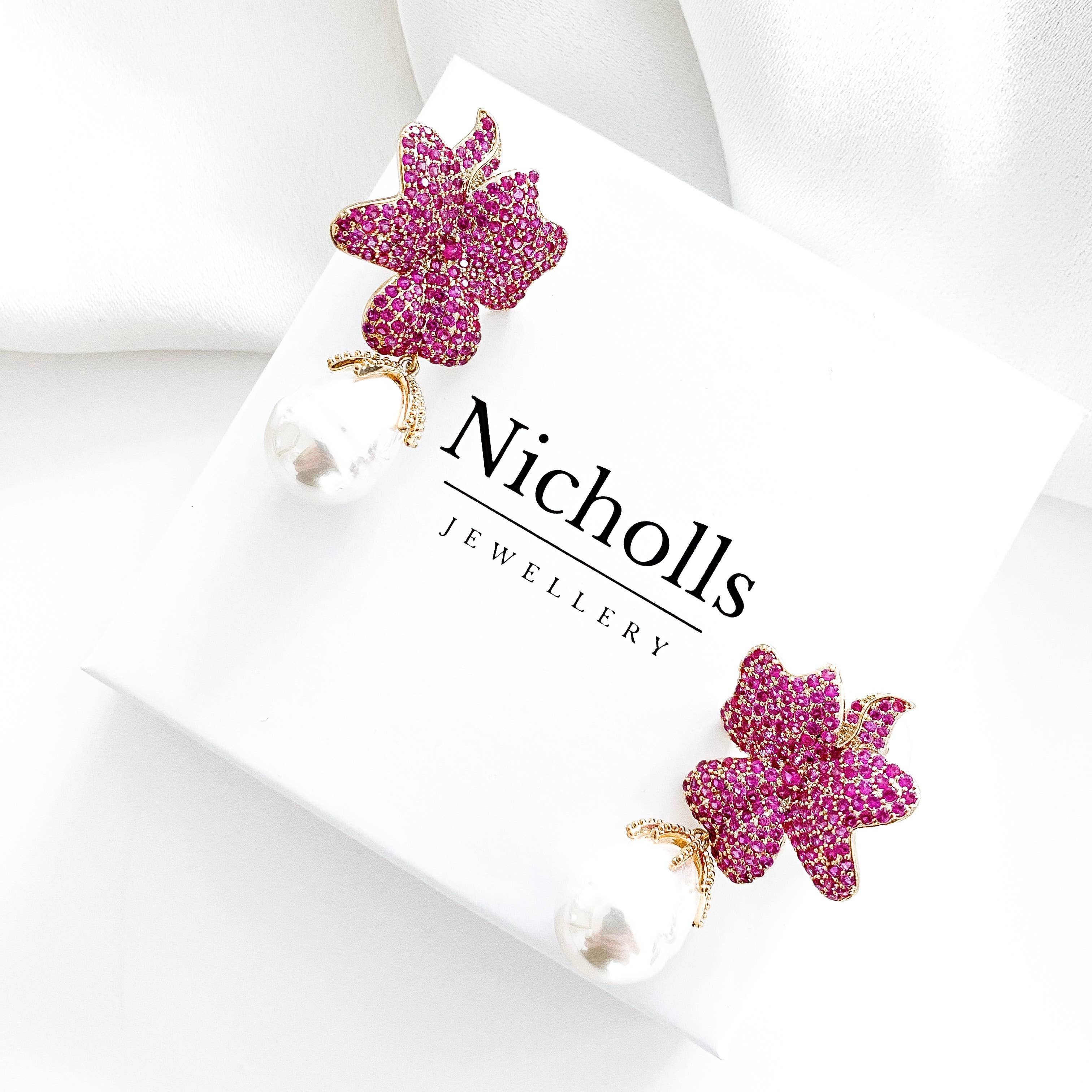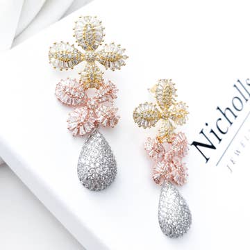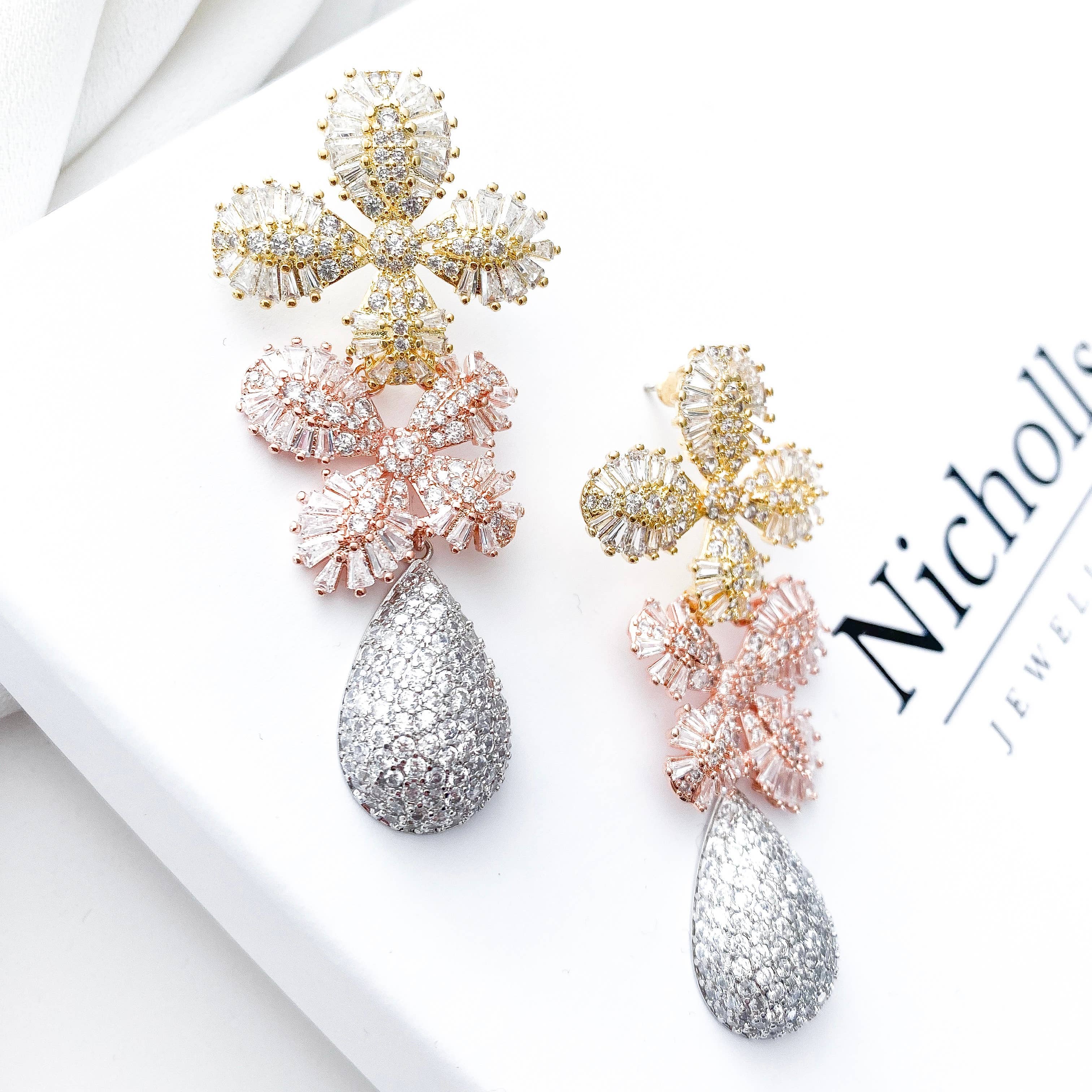 These stunning earrings feature high-quality, AAA* grade cubic zirconia crystals of gold, rose gold, and silver. Their intricate design consists of two delicate flowers and a teardrop, making them the perfect accessory for any special occasion. Stand out with these eye-catching earrings that are sure to turn heads. Comes in a Nicholls Jewellery branded box.