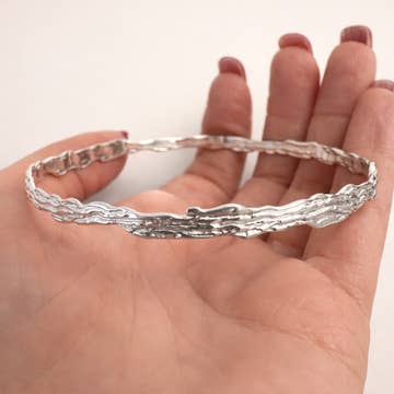 Sterling Silver Hawaiian Sun and Ocean Wave Bangle Bracelet Stamped: 925 Silver Metal: Genuine 925 Sterling silver Bracelet Width: 22 mm Bracelet Size: 7 inches Model # W3342