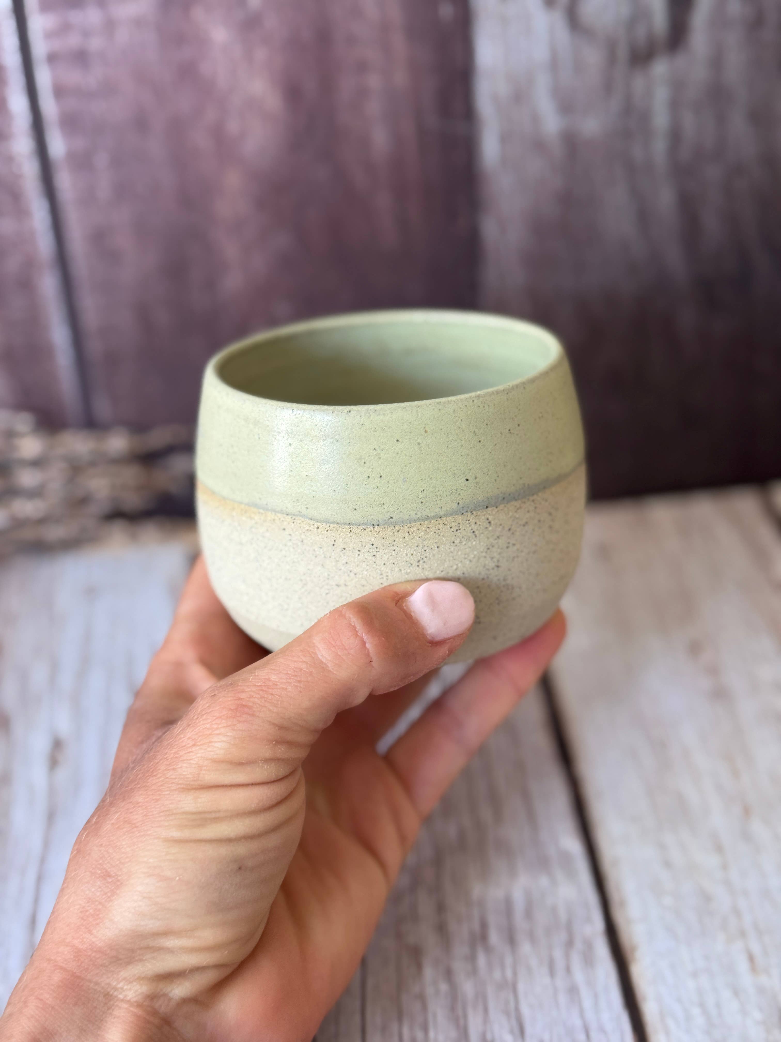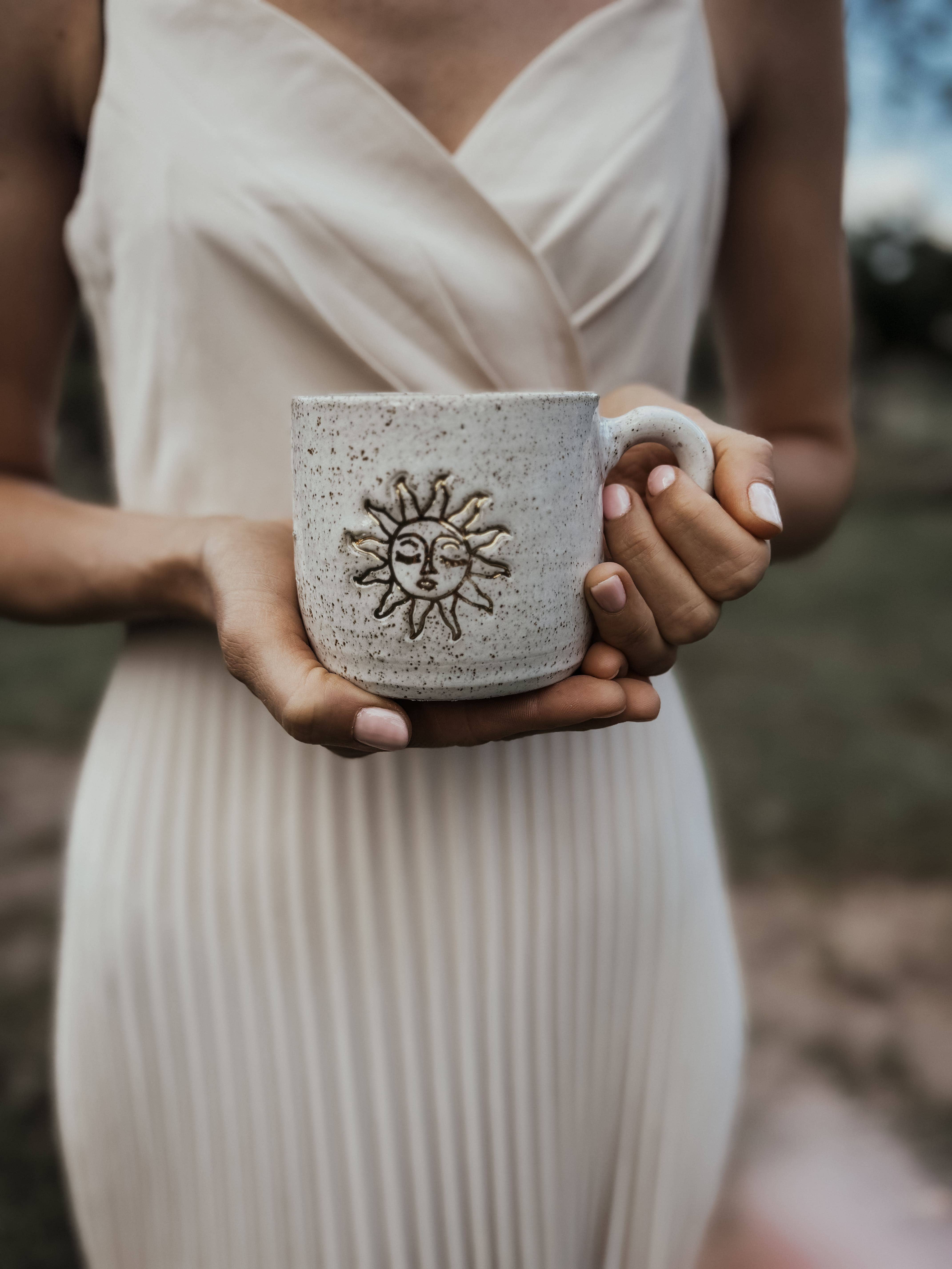 Small handmade ceramic moon mug, perfect for cacao ceremonies or a small cup of tea/coffee. Handmade in Australia. We take sustainability seriously: -Our handmade clay mugs are ethically created in small batches in Mount Tom, QLD -Our products are made with clay and quality glazes for a stunning finish you can enjoy for years to come. The mugs are approx. 8-9cm (high) x 8cm(width) +/-1cm. If you are purchasing more than one, please expect slight variations. Purchase without handle, or with left or right-handed design. Suitable for daily use. Please note: Mugs with gold lustre detailing should only be handwashed with a gentle sponge and regular detergent. They must not be used in the microwave or the dishwasher. All mugs are handmade to order. They take approx. 4 weeks to handcraft. All your items will be sent at the same time. Made in Australia.