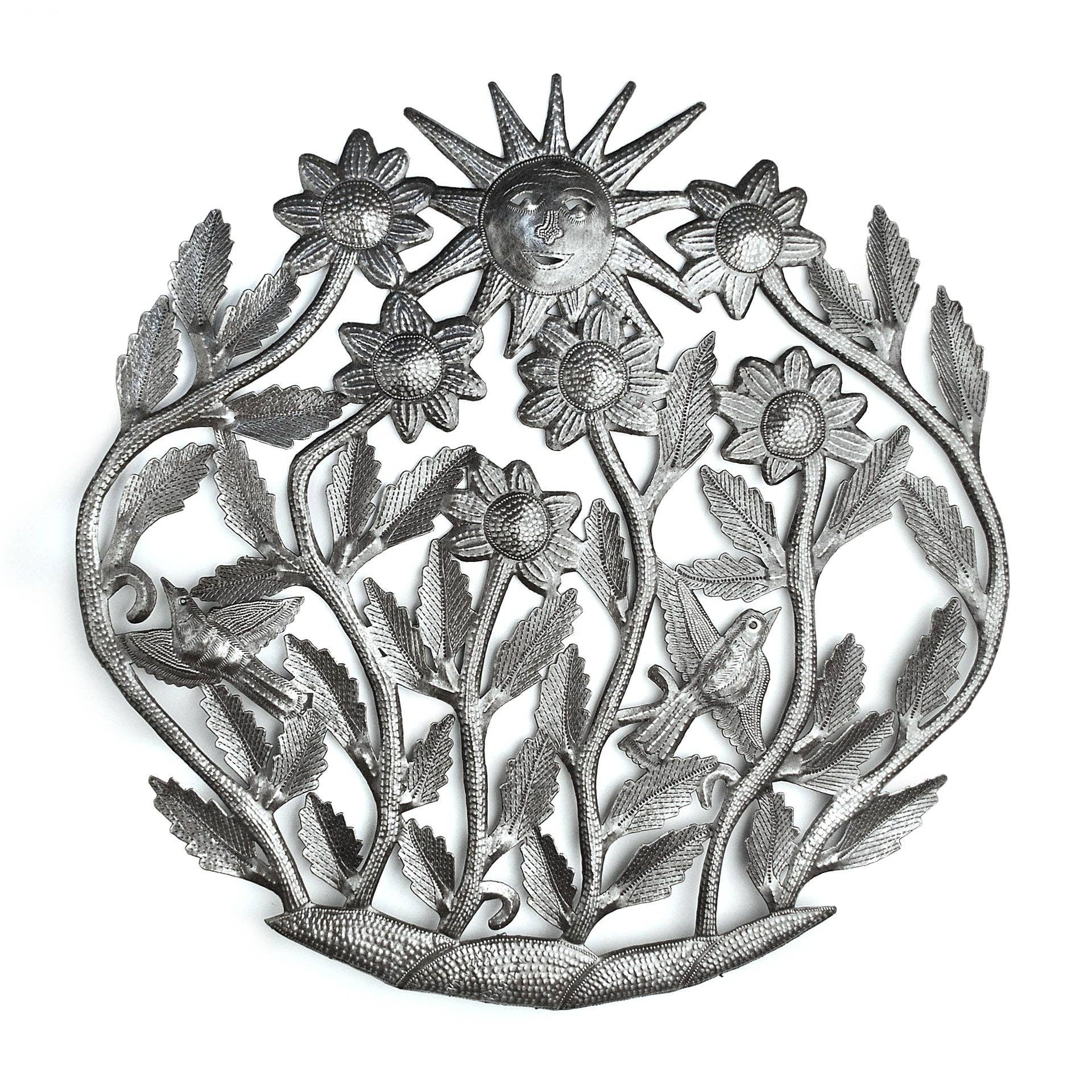 A 2022/2023 new arrival to the Beyond Borders Haitian metal art line. Painted Butterflies on the Wall is a painted panel metal art piece made for both indoor and outdoor decorative use. With unique circular details, colorful butterflies, and vibrantly painted flowers, Painted Butterflies on the Wall will make a visual statement in any home or garden. * Fair Trade Federation-certified Haitian metal art * Steel metal art painted and coated with a protective gloss varnish * Dimensions: 15" L x 10.5" W * Handcrafted at the Village Artistique de Noailles in Croix-des-Bouquets, Haiti by Haitian metal artisans A folk art that dates back to the mid-20th century, Haiti metal art today is the art of recycling and transforming discarded steel oil drums into ornate metal artwork. As handmade Haitian metal art, there will be slight variations from one piece to another, adding to the unique character and value of each piece of metal art.