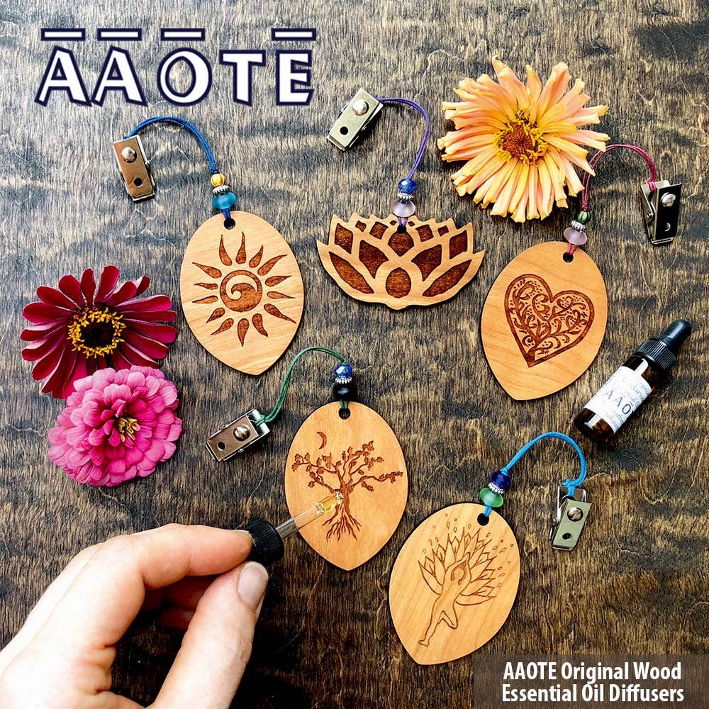 Engraved at AAOTE on sustainably grown, USA-sourced hardwoods. Created to bring more ways to enjoy aromatherapy in our day-to-day. These are lovely little, functional gift ideas for men and women. They are a nice introduction to our extensive Wood Diffuser Collection. These are 1/8" thick hardwood on a keychain ring. The wood piece itself is 2" tall x 1.5" wide. They are packaged with minimal packaging. We carry some nice essential oils to compliment these, as well.