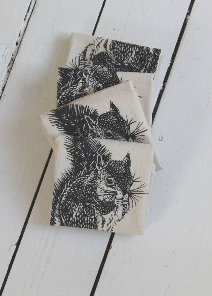 A set of four cloth napkins, hand-printed with my original Chicken design in black. Each napkin is 20" x 20", 100% natural organic cotton, washable and reusable. These soft and absorbent flour sack cotton napkins are printed in small batches using eco friendly ink.