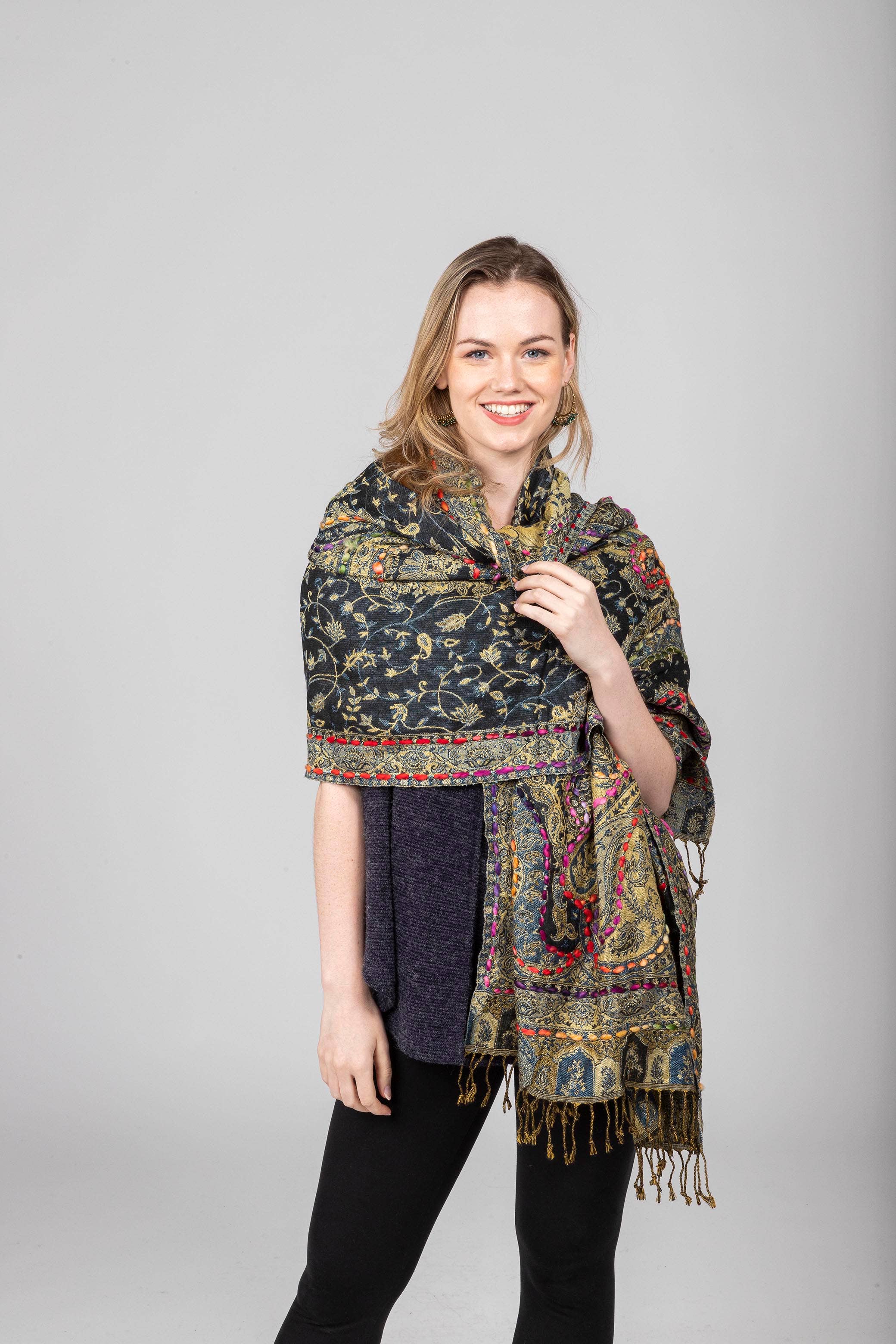 Featuring hand-embroidered paisley motifs and an open-front design, this jacquard jacket adds a vibrant touch to your look. Hand Embroided Open Front Acrylic Made in India