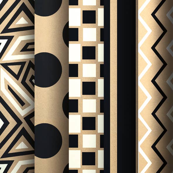 A simple range of eco friendly plain printed kraft papers. Printed on FSC™ certified recycled brown kraft paper with non-toxic water based ink and fully recyclable. Rolls are 3m x 70cm, supplied in units of 12 rolls in brown cartons (of one design, please choose your design). Rolls come wrapped in a recycled and recyclable film. All our wraps are designed, printed and converted by us in the UK. Also available assorted in display cartons, or in flat sheets 50 x 70cm which is more economical for shipment outside the UK.