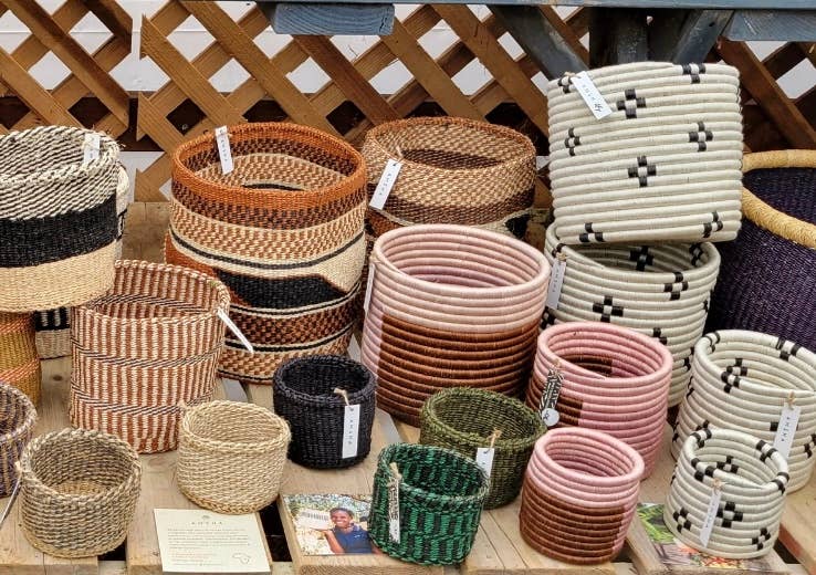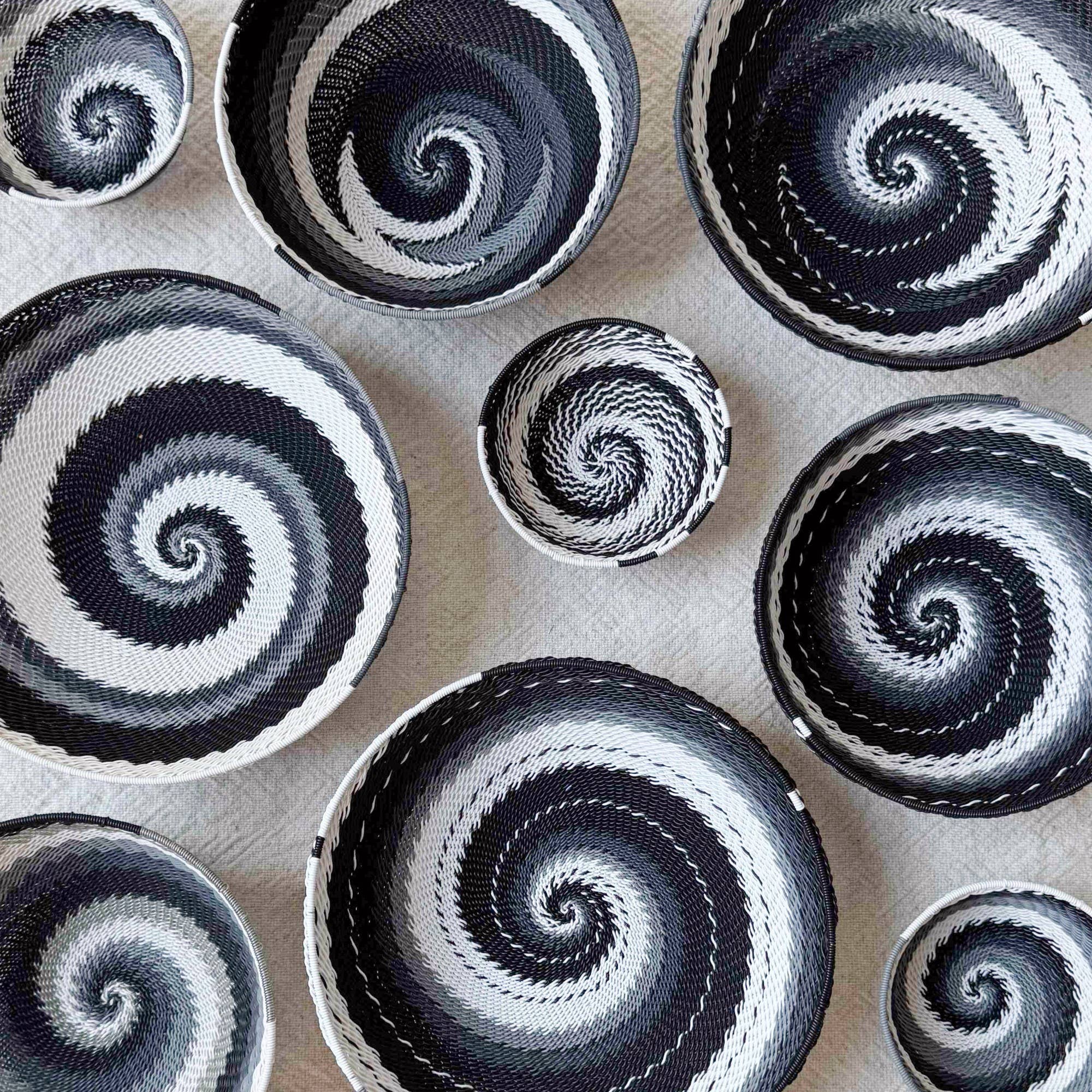 These beautiful bowls are handwoven in South Africa from telephone wire. The technique is unusual, as the weaver starts with the outer rim of the basket and moves towards the center as they weave. These bowls make the perfect ring dish, entry way bowl, or catchall to add a pop of color and pattern to your home. Small: 4" wide x 1.75" tall Medium: 6.5" wide x 2.5" tall Large: 8" wide x 2.75" tall Every bowl is unique in pattern and no two are exactly alike- you will receive a surprise! Ocean color: comprised of blues, turquoise, gray