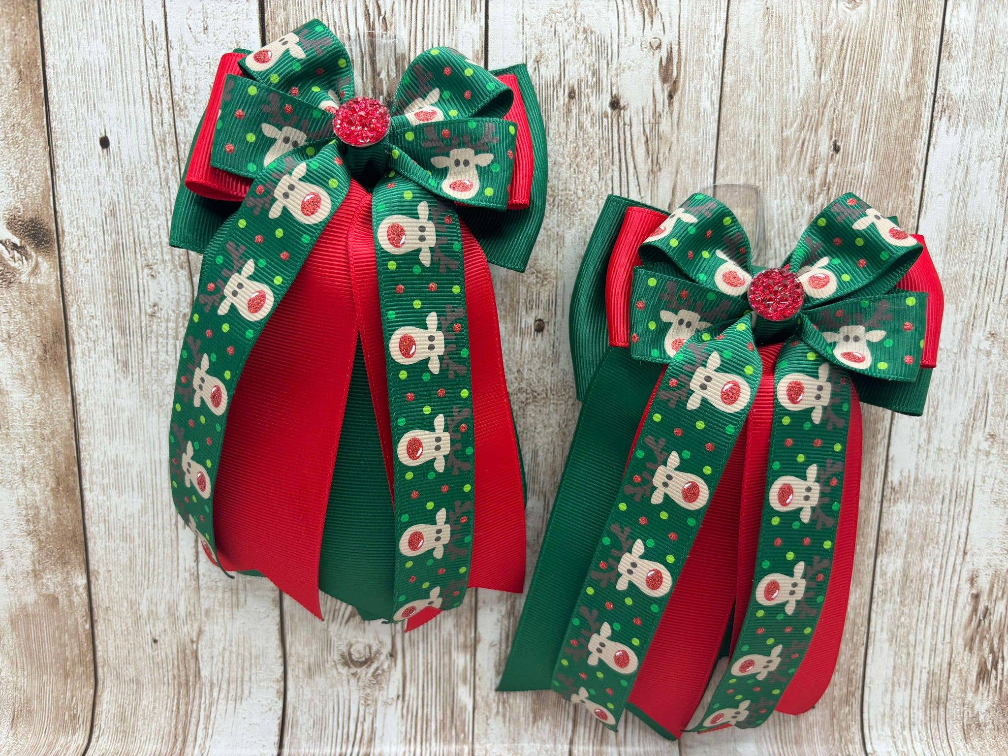 Horse show hair bows for short stirrup divisions, children's ponies divisions, and leadline. Beautiful, one-of-a-kind show bow, sold in a set. finished with a metal alligator clip in the back. Bows are sold in matching pairs. There are two bows to a set. you will need one set of bows for two braids. These bows are handmade. Though I do my best to make each bow in the set the same, there will be differences within the set.