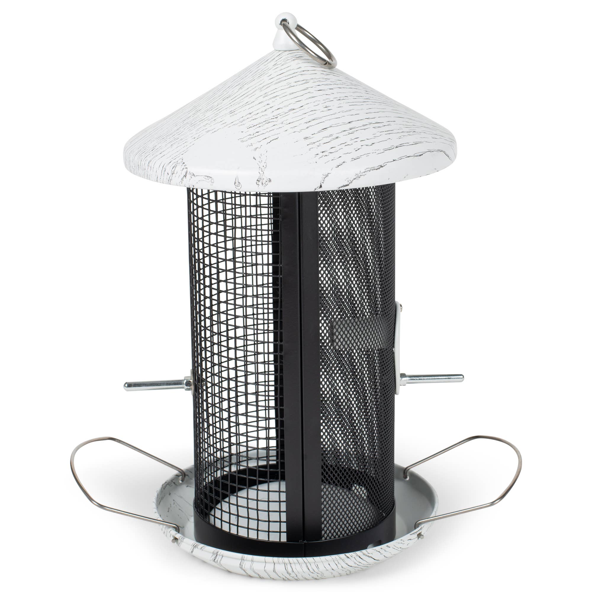 Varieties of seeds can be poured into this dual bird feeder in order to attract many types of wild birds all to one place. Hang from durable ring hook from a tree or garden post in your outdoor space or close to a window to enjoy visibility of birds coming and going. No assembly required and does not require any tools to gain access to the inside for cleaning or refilling seed. Simply shorten the handle and pivot the cap to remove top and fill with bird seeds that encourage birds like finches, sparrows and cardinals to visit. Leak-proof metal roof and holes in bottom tray for drainage allowing the feed to stay fresh. Holds approximately one (1) pound of feed.