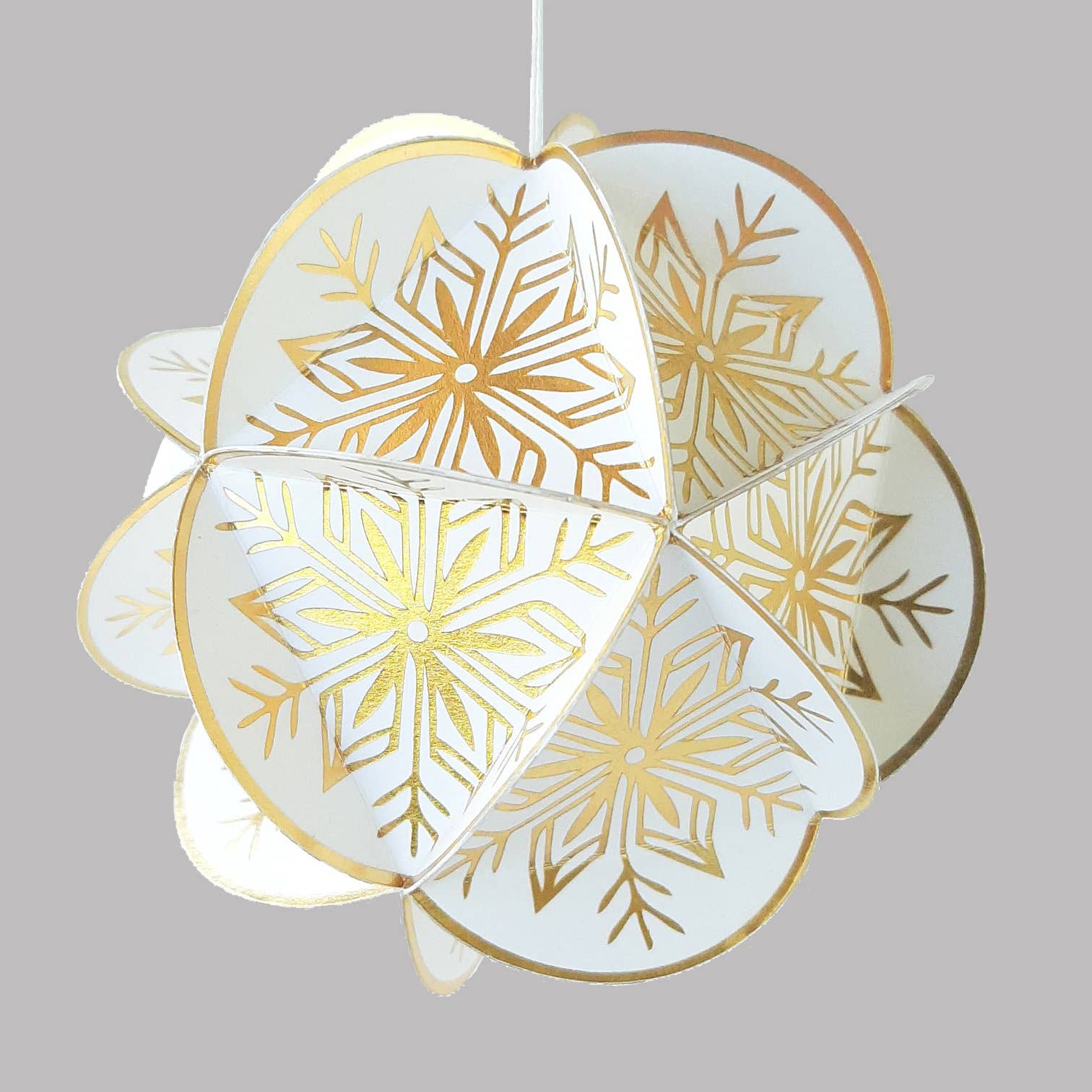 =Each kit contains hot foil stamped and die cut 2.25" circles, white cotton string and assembly instructions to assemble your own icosahedron (20 circles) globe ornament - Adhesive not included. We recommend using a glue stick, but white glue and double sided tape will work just as well - Each kit comes packaged in a custom die cut envelope made from 100% recycled paper. The envelope kits measure 3.5 x 3.5". - Assembled icosahedron measures approx 4" tall