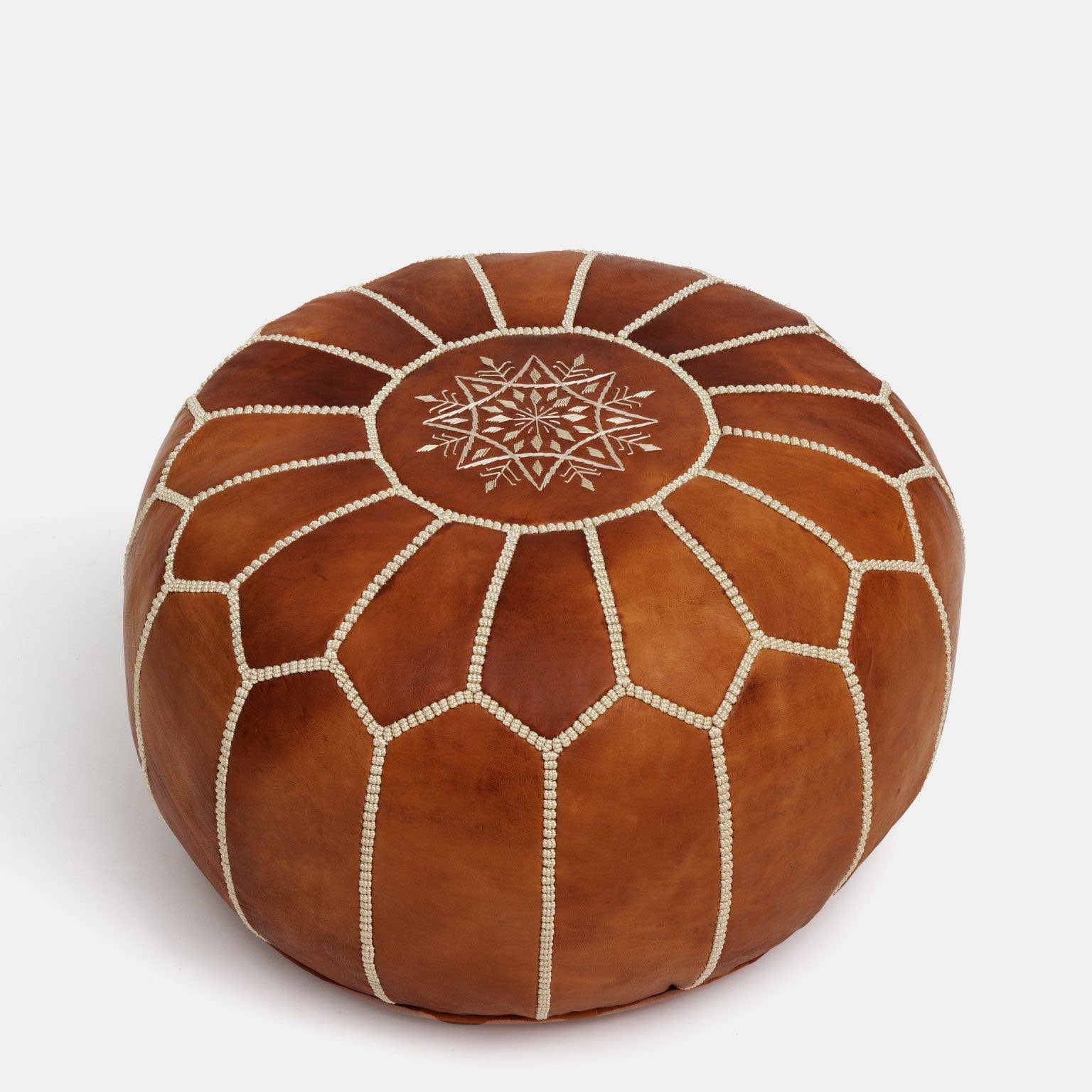 Our Moroccan poufs are made by skilled artisans in the ancient city of Marrakesh using traditionally tanned leather. Our products are entirely handmade, one at a time, which means that there may be slight variations in the color and embroidery. Our poufs are filled with clean certified recycled cotton that meets all US standards. Poufs can be maintained by wiping with a soft dry cloth, preferably microfiber. Mop up spills immediately. Stains may need to be professionally cleaned. Material - Gold Synthetic Leather. Size - 20" Diameter x 14" High.