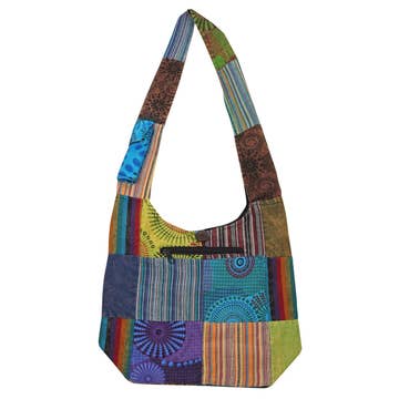 This charming bag tells a story of ancient wisdom meeting artisanal craft, centered around a luminous tree of life design. The embroidered tree glows in spring-green against a midnight backdrop, its branches curling into delicate spirals that dance against the dark canvas. Above the tree, a band of geometric patterns in turquoise and black creates a striking tribal-inspired border, featuring diamonds, zigzags, and angular motifs that echo traditional Nepalese textile designs. The bag's palette is thoughtfully layered - a turquoise strap flows into gentle pink-tinged sections, grounding down through the black centerpiece to an earthy golden hem at the base. At 7.5" x 8", it's perfectly sized for everyday essentials, while the brown button closure adds a rustic touch to this piece of wearable art.