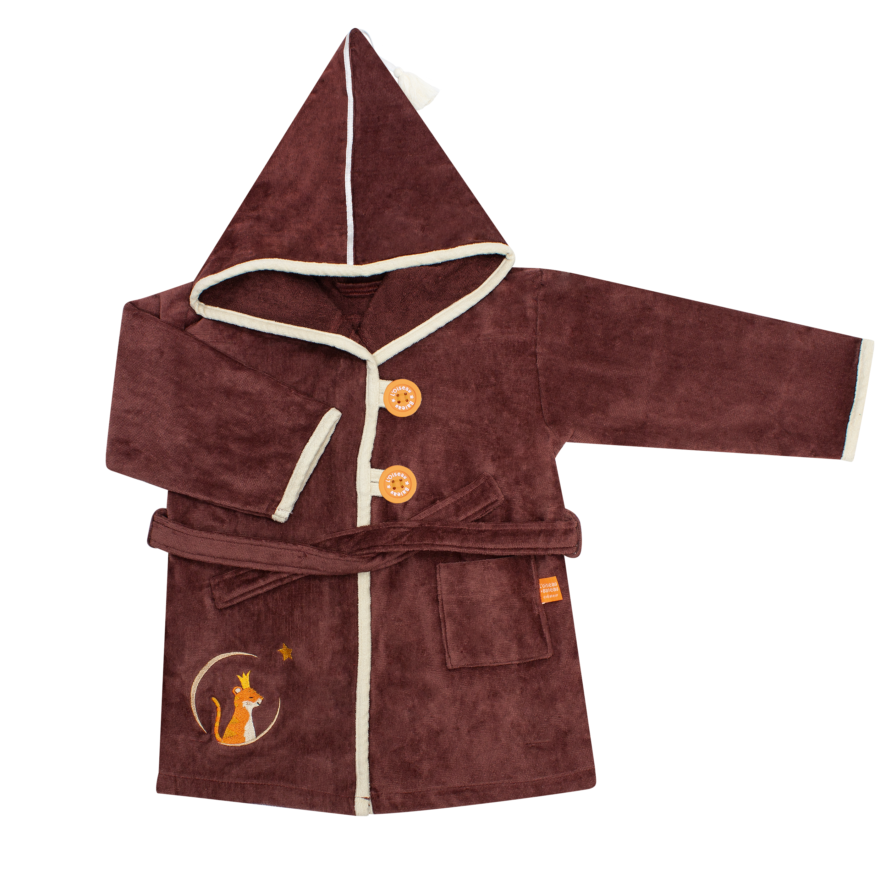 Our bath cape for babies and children is made of a quality velvet sponge in soft colors. Ideal after a bath, it is also the perfect ally for sea bathing! Enveloping thanks to its beautiful fullness, it will dry quickly and keep children warm. The little extra? A hood decorated with an adorable pompom to keep your head warm! Each cloak is decorated with beautiful embroidery, representing a crowned animal. Here we find a pretty rabbit! It's the perfect birth gift! In addition, our swim cape is customizable. * Measurements: 80 x 85 cm * Material: 100% OEKO-TEX® FABRIC (The OEKO-tex label certifies the absence of substances harmful to health and the skin) * Recommended age: 0-5 years * Care: Machine wash at 30°C, tumble dryer and soaking not recommended. * Technical characteristics: button closure