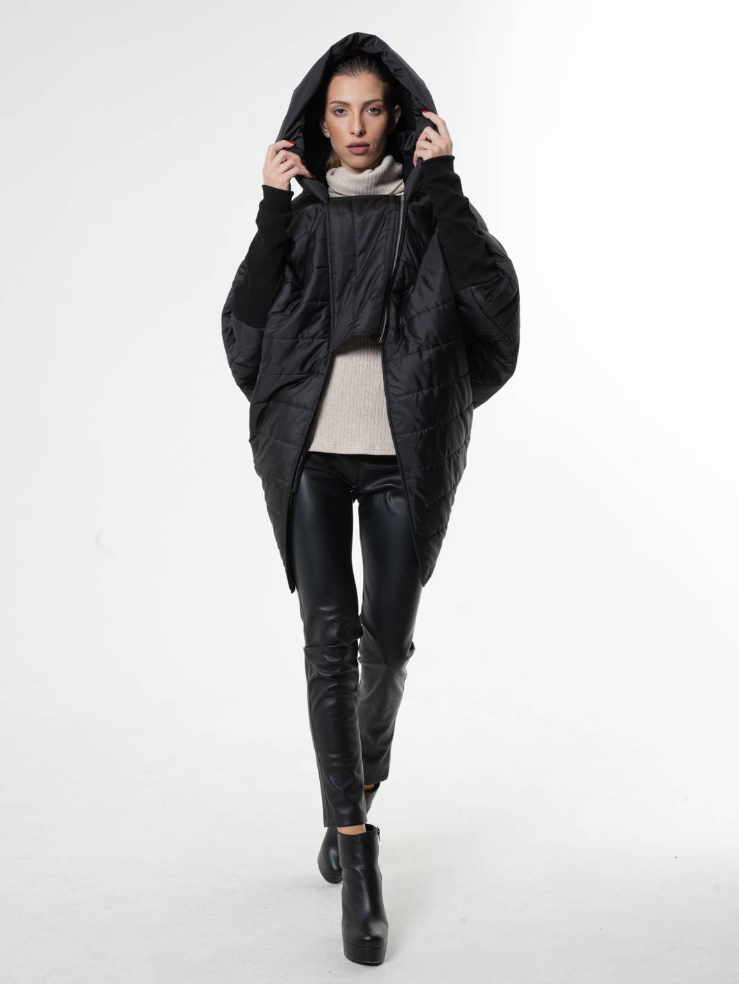 Extravagant Wool Coat - METC0098 Have you ever looked at the fashion magazines and wished to look like the ladies in them? Now you have the chance to make your dream come true! With love and desire to help everyone feel better by looking their best, we created a coat that has a place in every art collection! It is made of two different materials that are contrasting not just in nature but color as well. The oversize hem and half of the sleeve are made of puffer black while the main structure is kept more basic. The fit is loose and comfortable allowing you to wear a heavier outfit if the weather gets too cold. Another detail here is the oversize collar that gives the piece a finished look. Comfort is always a must therefore we added a zipper closure, side pockets and lining. Choose it for your next big event and you will be showered in compliments in no time! Material: Grey part- cashmere/ wool/ polyester; Black part- puffy black polyamide. Care: Dry clean only.