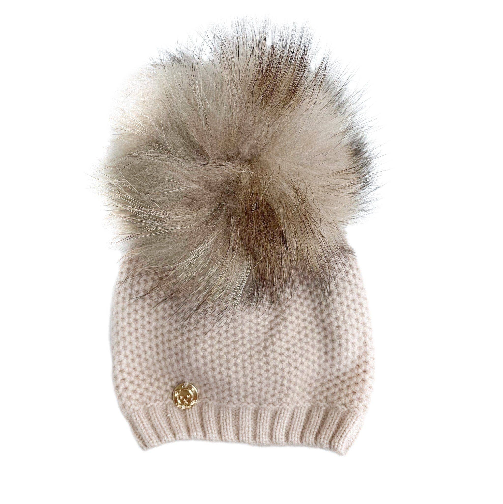 Petite Maison Kids. 100% Cashmere knit aviator style winter hat with ear coverage. Super soft and stretchy. Detachable natural pom. Due to the natural properties of the pom, it’s normal to have some variations in the shape and the color of tips. Unisex. Small: Newborn - 12M Medium: 12M - 4 Years Comes in four cute colors - Oatmeal, Pink, Ivory, and Grey! Care Instructions: Remove pom. Hand wash in cold water. Lay flat to dry. Dry clean recommended.