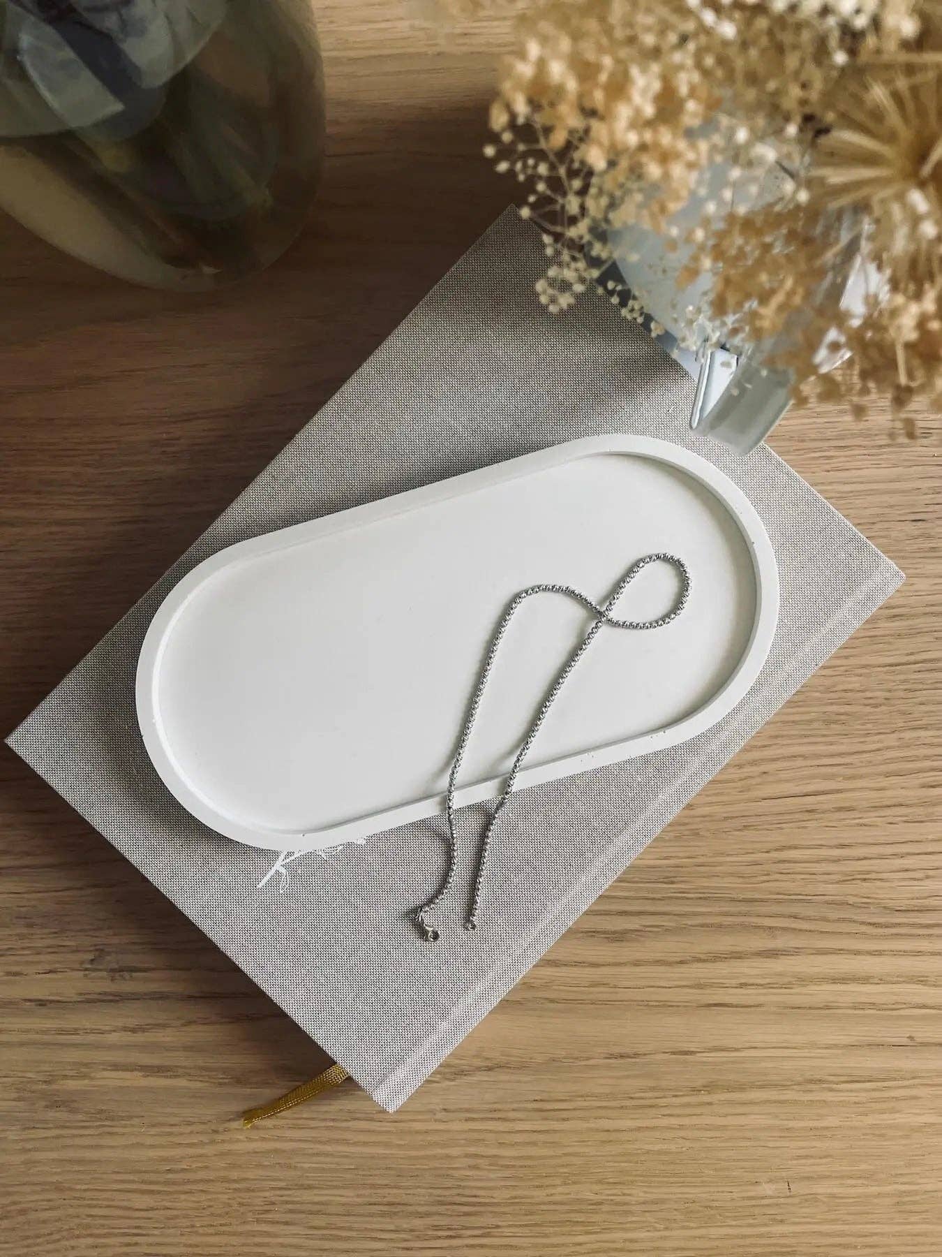 Minimalist small tray for your interior decoration. Inside, you can place jewelry, accessories, and other small items. You can also let your candles burn there without any risk. * Size: 16 cm x 17.8 cm * Weight: 284 g * Made from jesmonite * Natural, vegan, non-toxic, and durable * Handmade in France As each piece is hand-mixed and poured, slight imperfections, color variations, and air bubbles may naturally occur. The following are not considered defects but rather unique characteristics of each of our pieces. They are also sealed with a water-based sealant, but we recommend quickly wiping spills with a soft cloth.