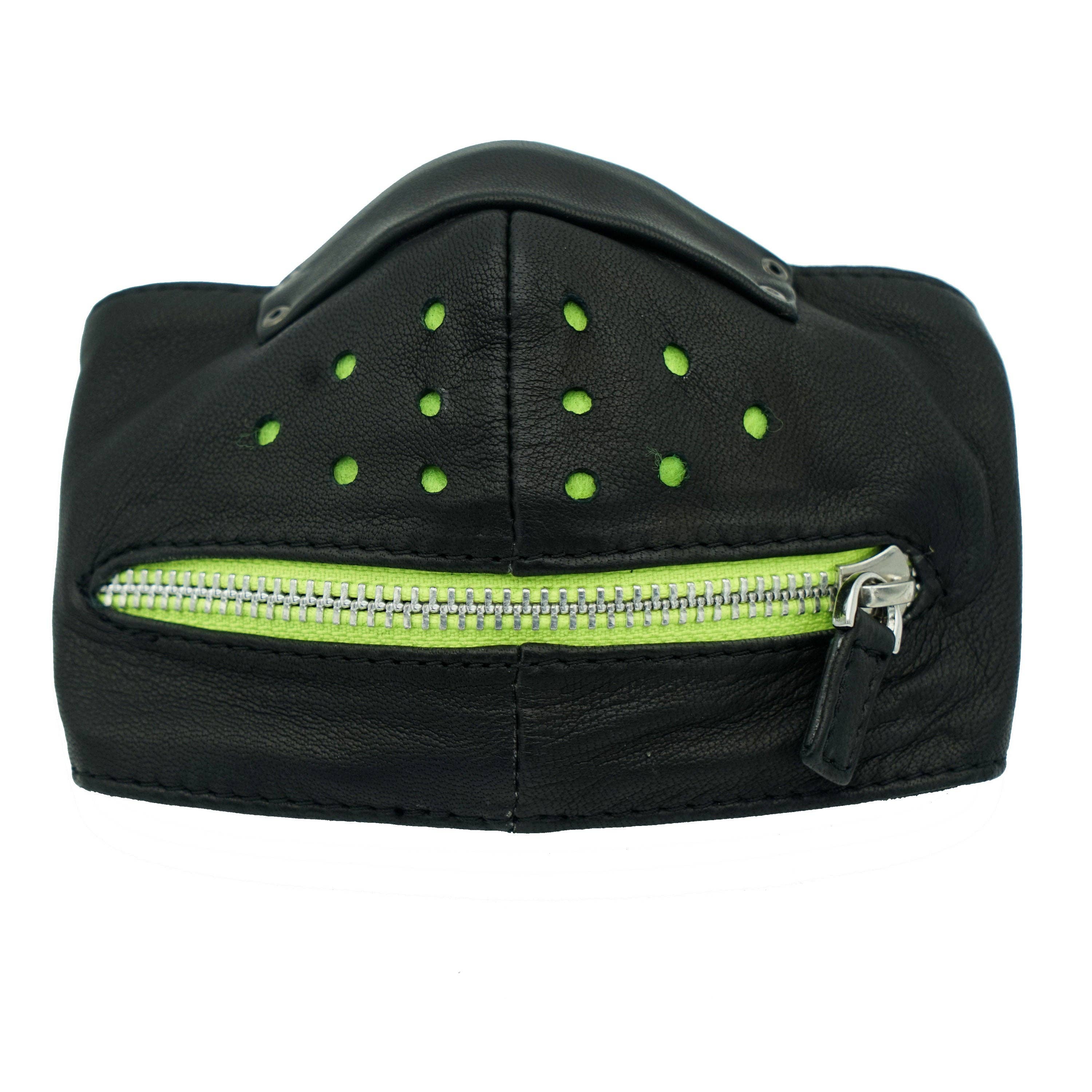 The Teal Zipper Mouth Face Protection mask is made with soft premium garment leather. The middle nose section has holes in the leather, making the mask breathable. Underneath the holes is a middle layer of felt fabric that acts as a filter. Above the holes is a nose pinch with flexible aluminum allowing for it form to the contour of the nose. On the bottom is a functioning zipper, making it possible to talk or even eat with your mask on. The bottom layer is made with soft organic bamboo fabric that is comfortable on the face. MADE TO ORDER 3 WEEKS Comes in Mens and Womens. Here are the dimensions: Womens (Size S/M) - Front of Mask: 11" from side to side.
