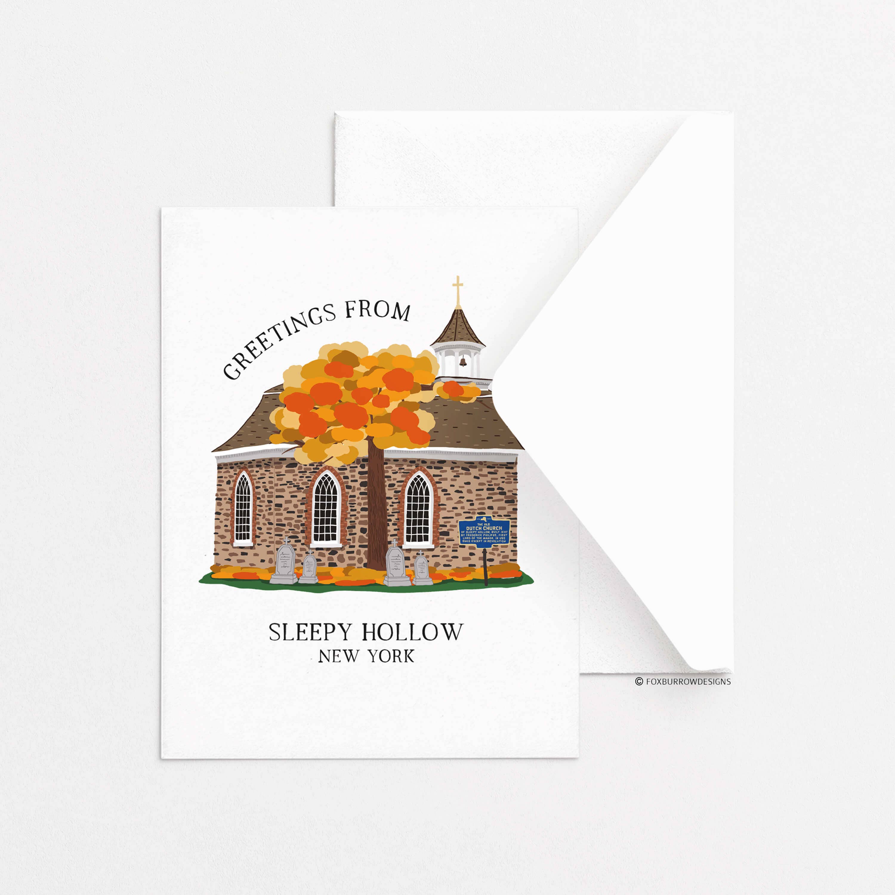 Steeping in myth and folklore, Sleepy Hollow, NY is the ultimate fall destination in the Hudson Valley! A2 Greeting Card Envelope included. Blank Inside for personal message. Packaged in clear sheet for protection. Minimum 10 cards per style.