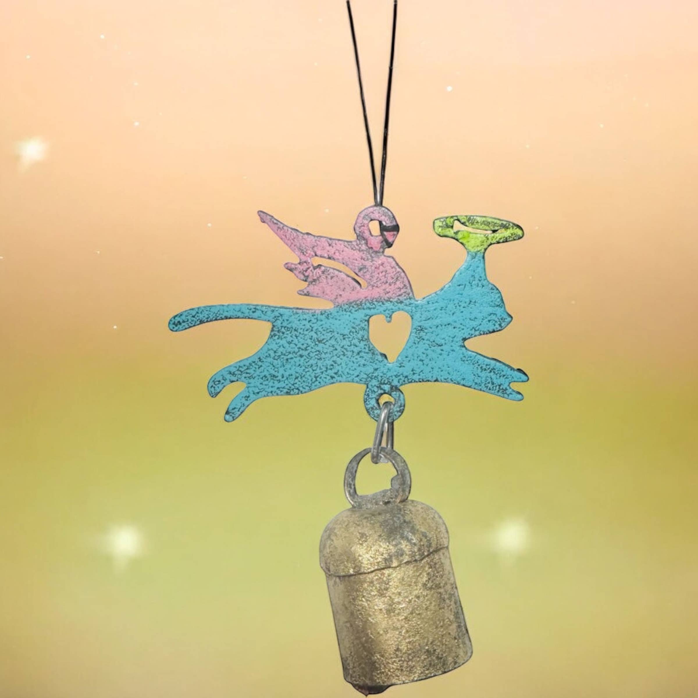Enjoy the magic any time of the day when you display this beautiful celestial wind chime on your porch or patio. Delightful chime features a painted metal piece accented with a traditional, hand tuned nana bell. It measures 15" long and has three bells. Can hang outside from your favorite tree, in a garden or displayed in a window inside the house, this chime is sure to be seen and heard wherever you place it. Also makes a great housewarming, birthday, Mother's Day, Father's Day or holiday gift. These are built from start to finish in our Texas Studio. We use recycled metals that are sourced all over the United States. We only use US Steel. Painted assorted colors on front side and back is clear coated brown.