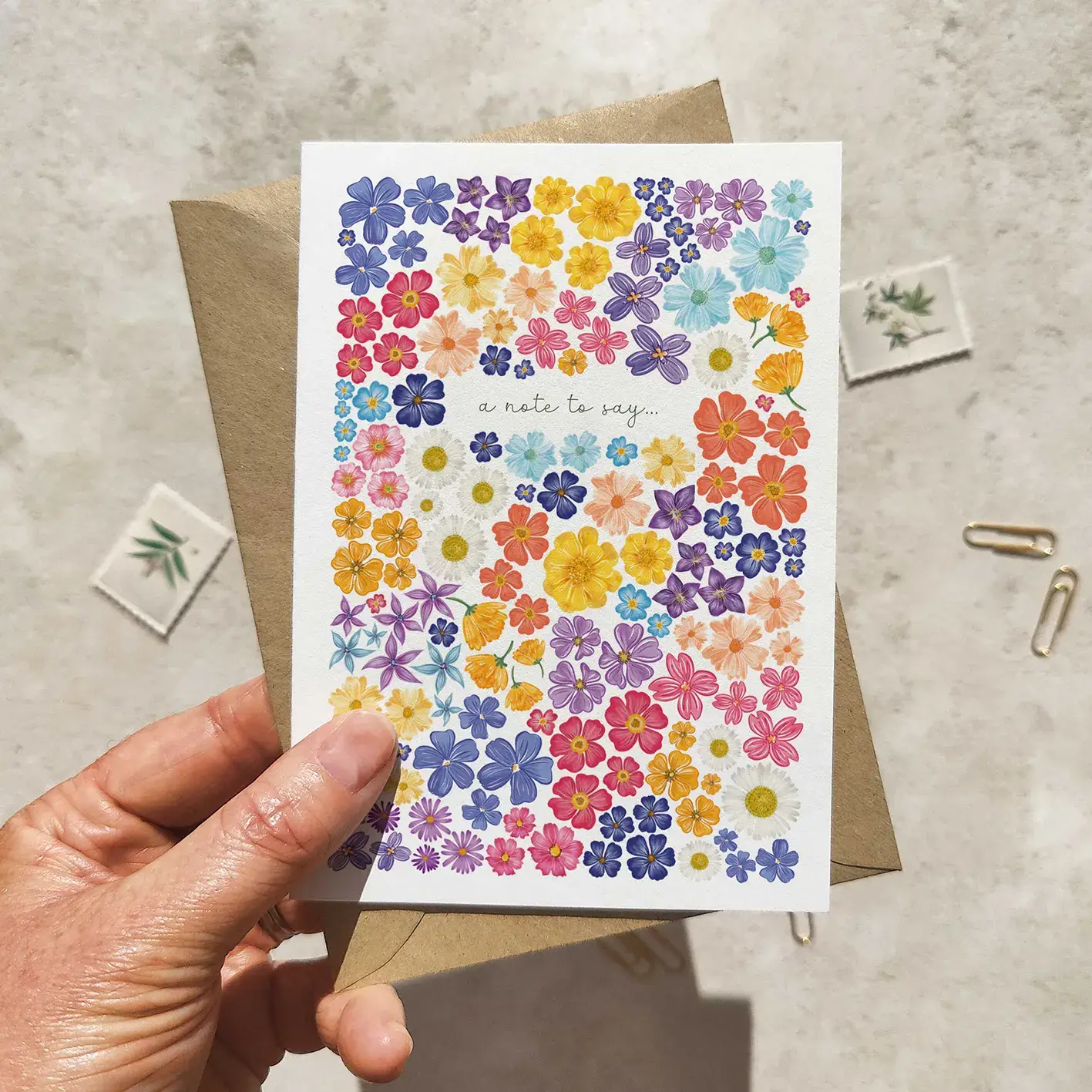 This design features a pressed wildflower pattern painted in watercolours. Folded flower note cards made from thick luxury off-white cardboard, digitally printed and supplied with plain kraft brown envelopes. Folded size: 105mm x 148mm Packaged in a transparent bag with sticker or you can order the cards without packaging.