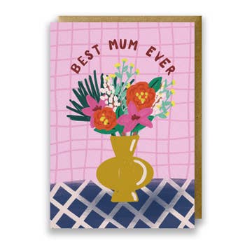 A6 size illustrated greeting card with scallop frame and vase of flowers, printed onto premium matt card with a bright red envelope. Hand drawn lettering reads 'Happy Mother's Day to the best mum'. Cards are printed to order in the UK and arrive plastic free, nested and banded in 6's.
