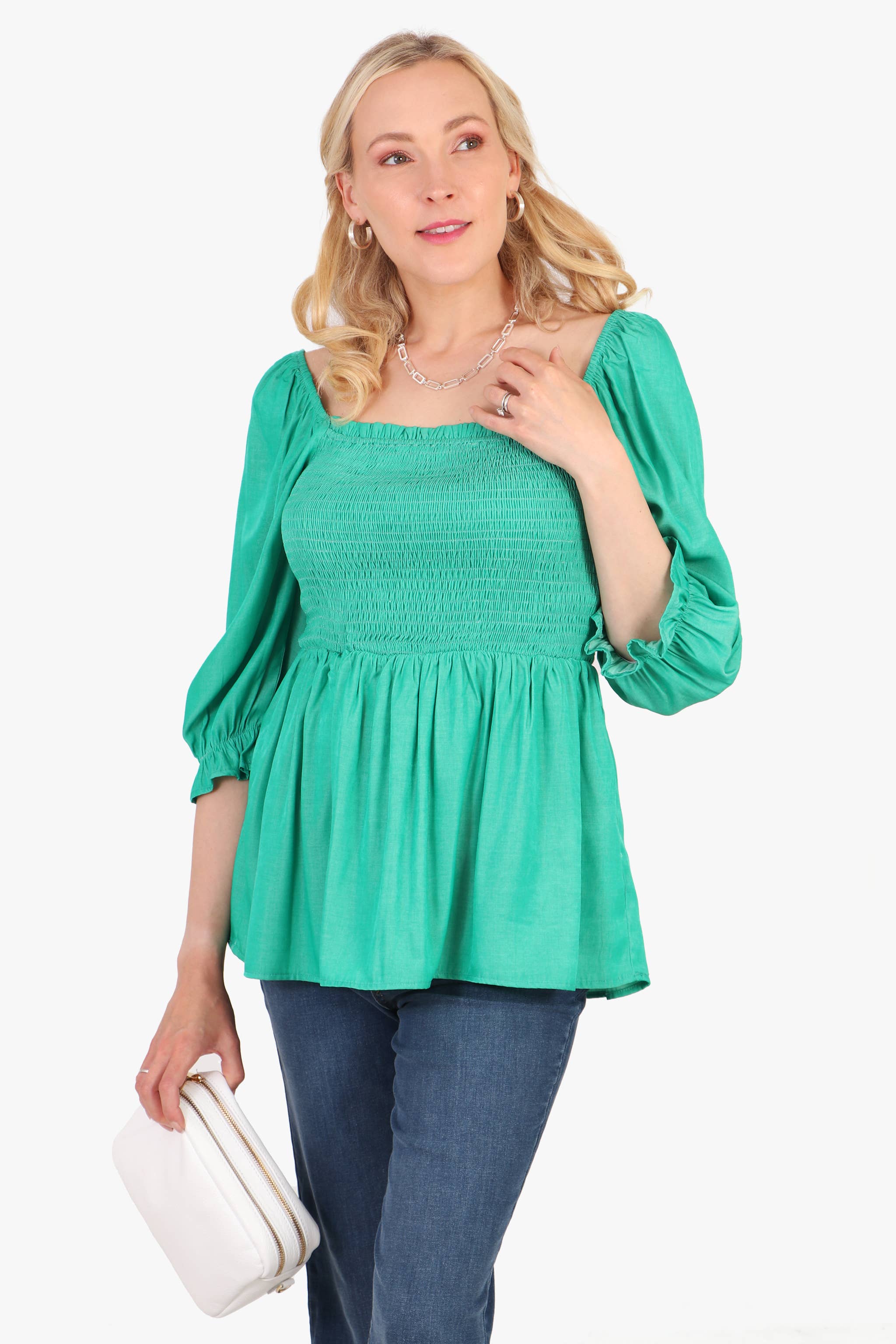 A versatile denim look milkmaid top featuring a fully shirred bodice, a flattering peplum design with mid length sleeves. * Plain Textured Peplum Milkmaid Top in Blue Denim Look * Square Neckline * 3/4 Length Sleeve * Ruffled Cuff * Flattering Peplum Waist * Shirred Bodice * 100% Cotton * Gillian is 5'10" and wears a UK 10 / EU 38 / US 6 - Wearing size: Small (8-10) * Anisah is 5'7" and wears a UK 14-16 / EU 42-44 / US 10-12 - Wearing size: Medium (12-14) * Machine Washable (Delicate)