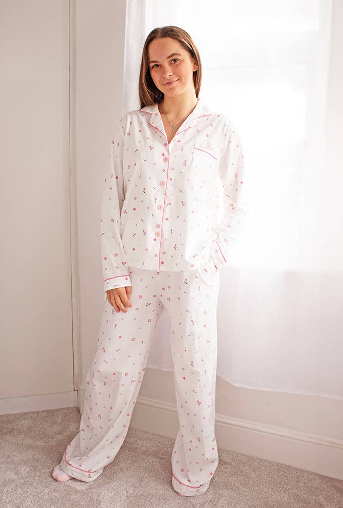 Collared Pyjama Shirt Matching Pyjama Bottoms Embroidered Logo Chest Pocket Button-Up Front Relaxed Fit Wide Leg Trousers Elasticated Waistband Trouser Side Pockets Consciously created with 100% Cotton Model info: Beth // Size 8-10 // Height 170 CM // TreatBox Size Small