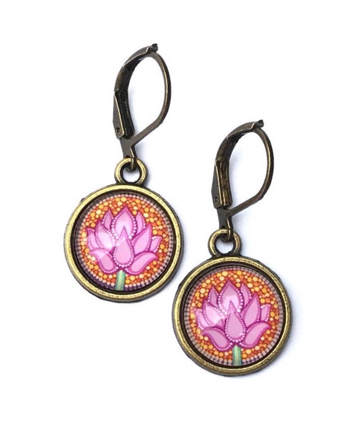 These Sunbeam Photo Glass earrings hang 1 1/8” off of antiqued brass ear wires. Nickel Safe ✨✨✨ I love, love, love leverback ear wires. After too many years of losing one earring, I switched all my earrings to leverback. They open on a hinge. Pull open and push shut. Never lose an earring again! ✨✨✨✨ They comes displayed on a handmade card. The card is made of a heavy recyclable card stock and is designed by Dreamspirit. It is folded with a flap on the front so it can hang on most displays. The card size is 3” x 2”