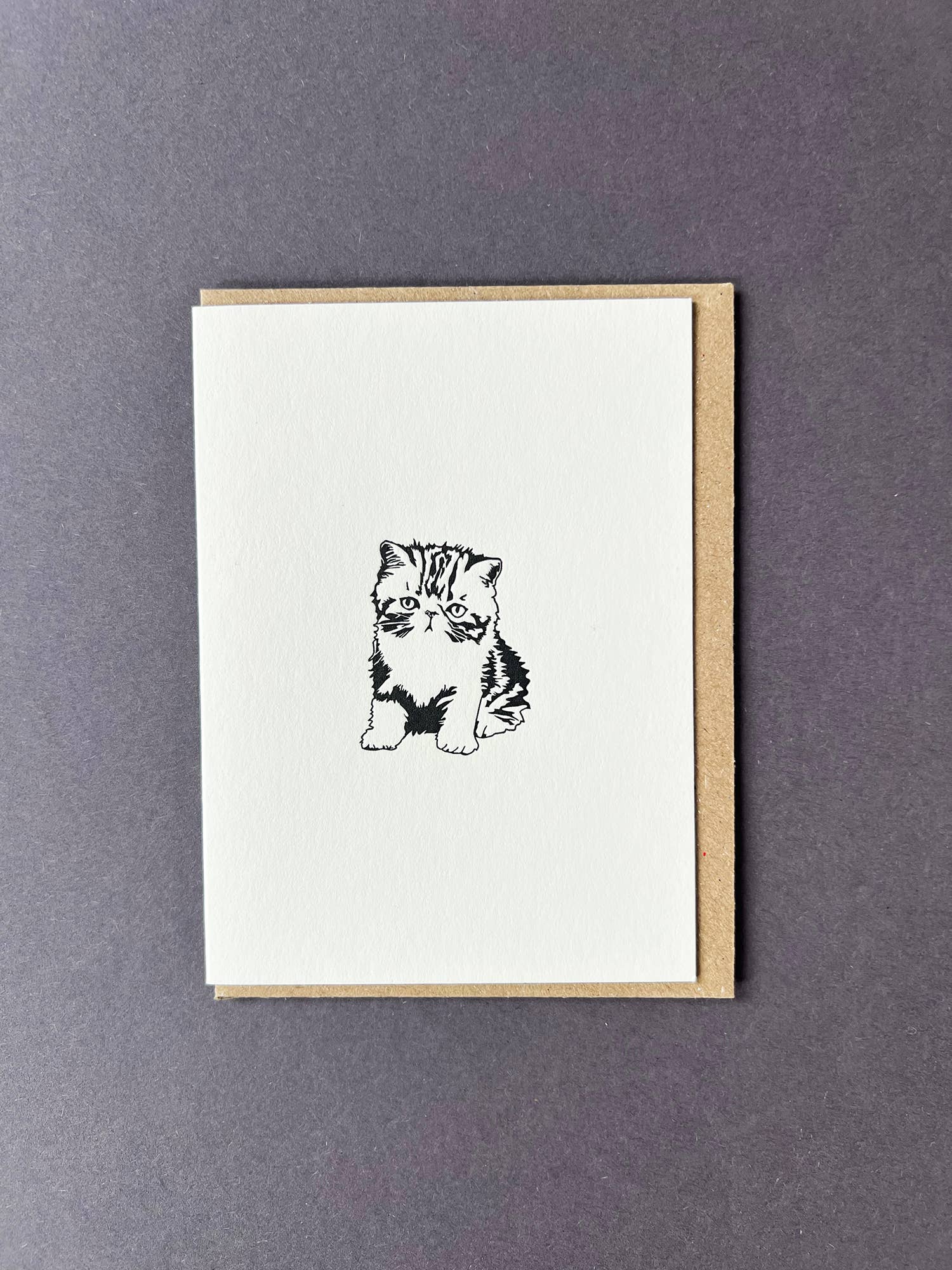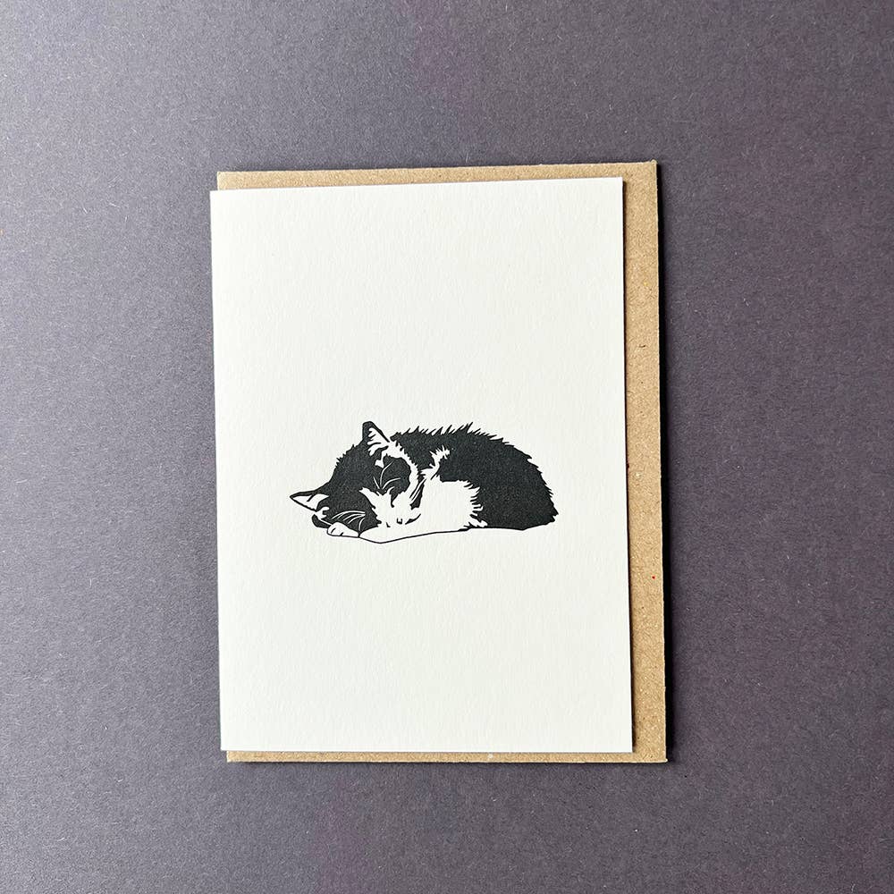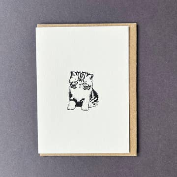 This gorgeous letterpress greetings card George Cat is illustrated with an exotic short-haired cat called George. Watch out this cat has attitude, he's not going to share his treats. Printed in black showing the details in the cat's fur. Perfect to send to any cat lover for their birthday, say thank you or just because. Letterpress is a beautiful vintage technique using gorgeous machines, it is a true craft. The cards have a tactile, embossed finish, exuding quality with thick paper stock and crisp pressed design. Card Size 78 x 107mm, with C7 envelope. Designed in Bristol, printed by lovely people in Gloucester, in the UK. Sustainability is very important to us at Penguin Ink and therefore we use 100% recycled board for all our cards. As a result, our cards, envelopes and boxes are all recyclable. Read more about our sustainability here. This illustration is an original by Penguin ink. © Penguin Ink
