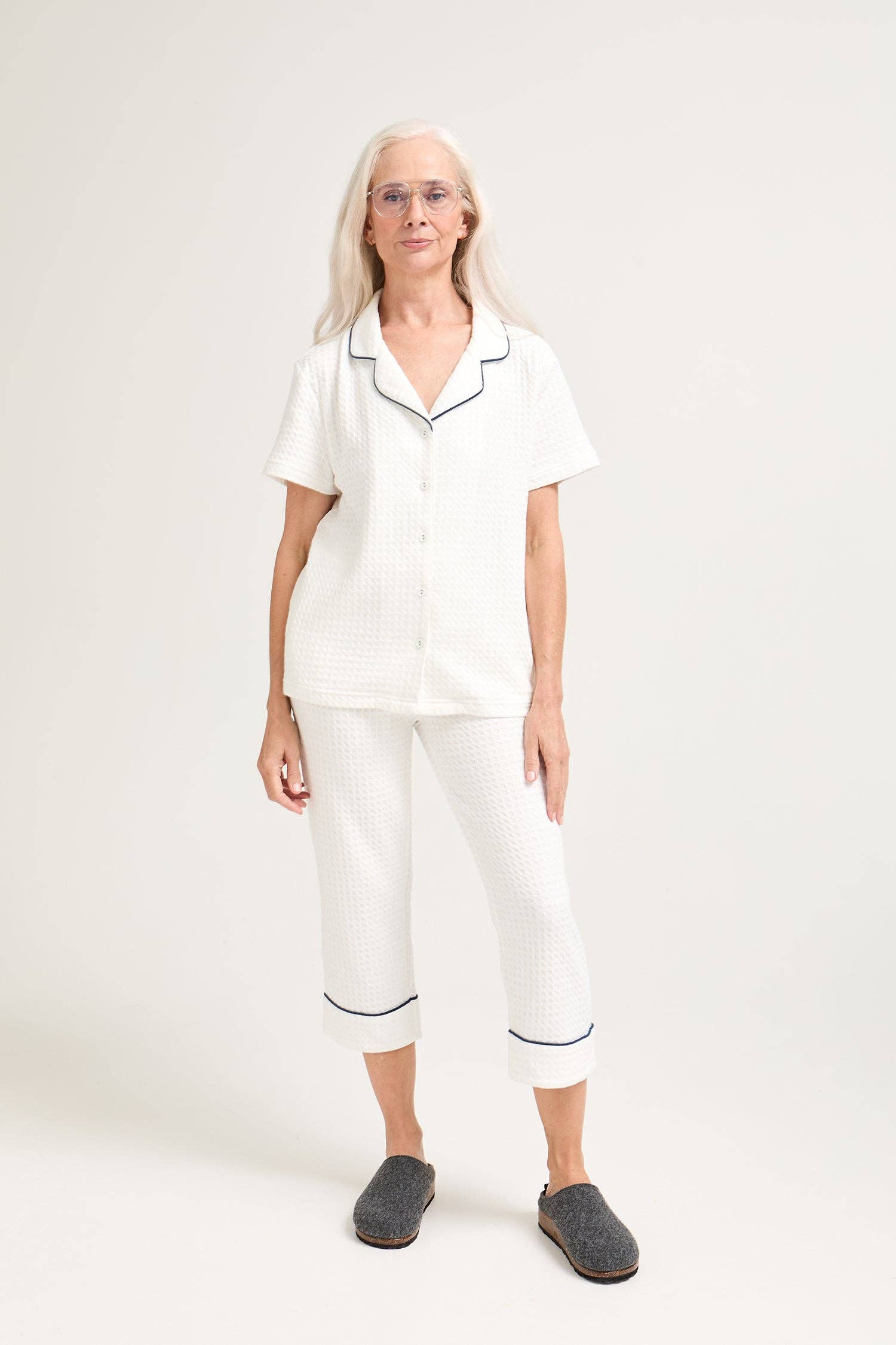Introducing the Luxury Suite range by Pretty You London. Taking inspiration from luxury hotel suites and serene spas, this waffle poly-cotton collection takes you straight into relaxation mode. Our Waffle Pyjama Set boasts a premium weight and luxurious cotton-blend feel against the skin, perfect for any season. The shirt has long sleeves and a featured pocket whilst the trousers are a straight shape and full length leg. Pair perfectly with our matching slippers, Gia. Available in Marine Blue, Grey and White.