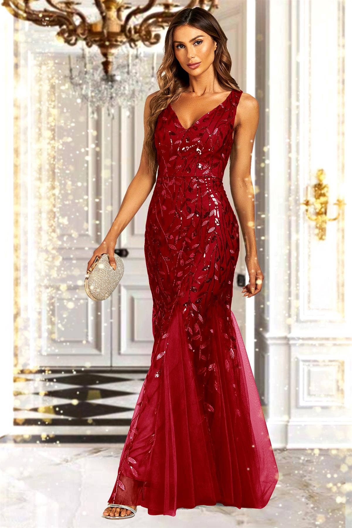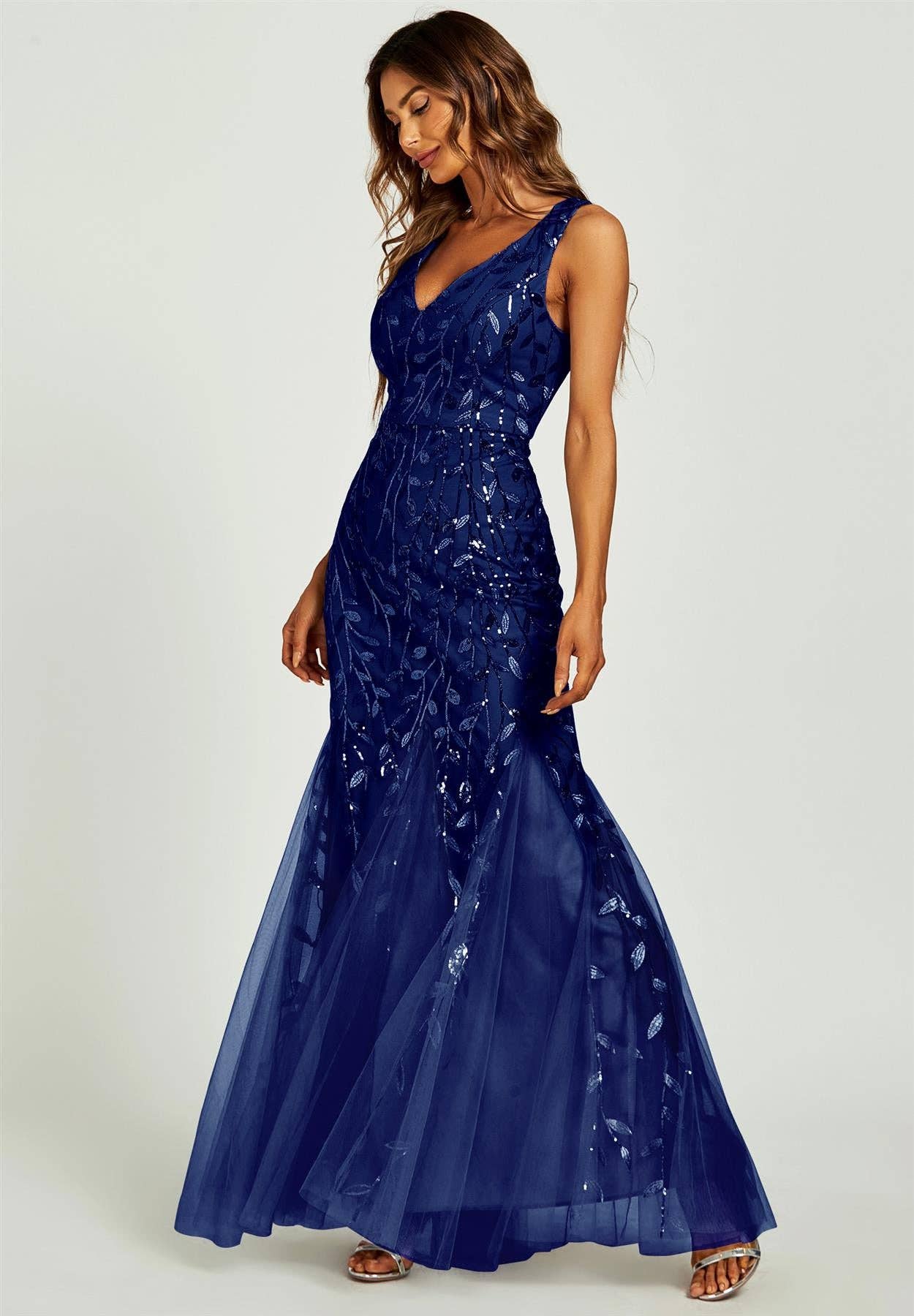 Introducing our Floor-Hitting Length V-Neck Sequin Leaf Embroidered Occasion Dress, a dazzling masterpiece designed to make you shine like a star at your most special events. The standout feature of this dress is the exquisite sequin leaf embroidery. Each leaf is meticulously crafted to catch the light, creating a mesmerizing sparkle that will turn heads wherever you go. The embroidery adds a touch of nature-inspired charm and whimsy to the overall design. The flattering V-neckline beautifully frames your décolletage, adding a touch of allure and sophistication. It allows you to showcase your favourite jewelry or accessories, enhancing the overall elegance of the dress. Pair this occasion dress with your favorite heels and statement accessories to complete your red carpet-worthy look. - Party Wear - Race Day Dress - Perfect for casual occasions & wedding guest & Engagement Party Size guide UK size XS 8 S 10 M 12 L 14 XL 16 Measurements Model wears: UK 8/ EU 36/ US 4 Model's height: 175cm/ 5'8'' Composition 100% Polyester