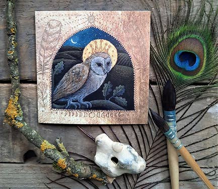 Owl, Fox, Hare and Badger listening to the Song from the Land This card is being sent direct from our little workshop in Cornwall Blank greetings card Card Size 7 by 5 inches/125 by 175mm Supplied with an envelope Fully recyclable and biodegradable We hope you like this card as much as we liked creating it.